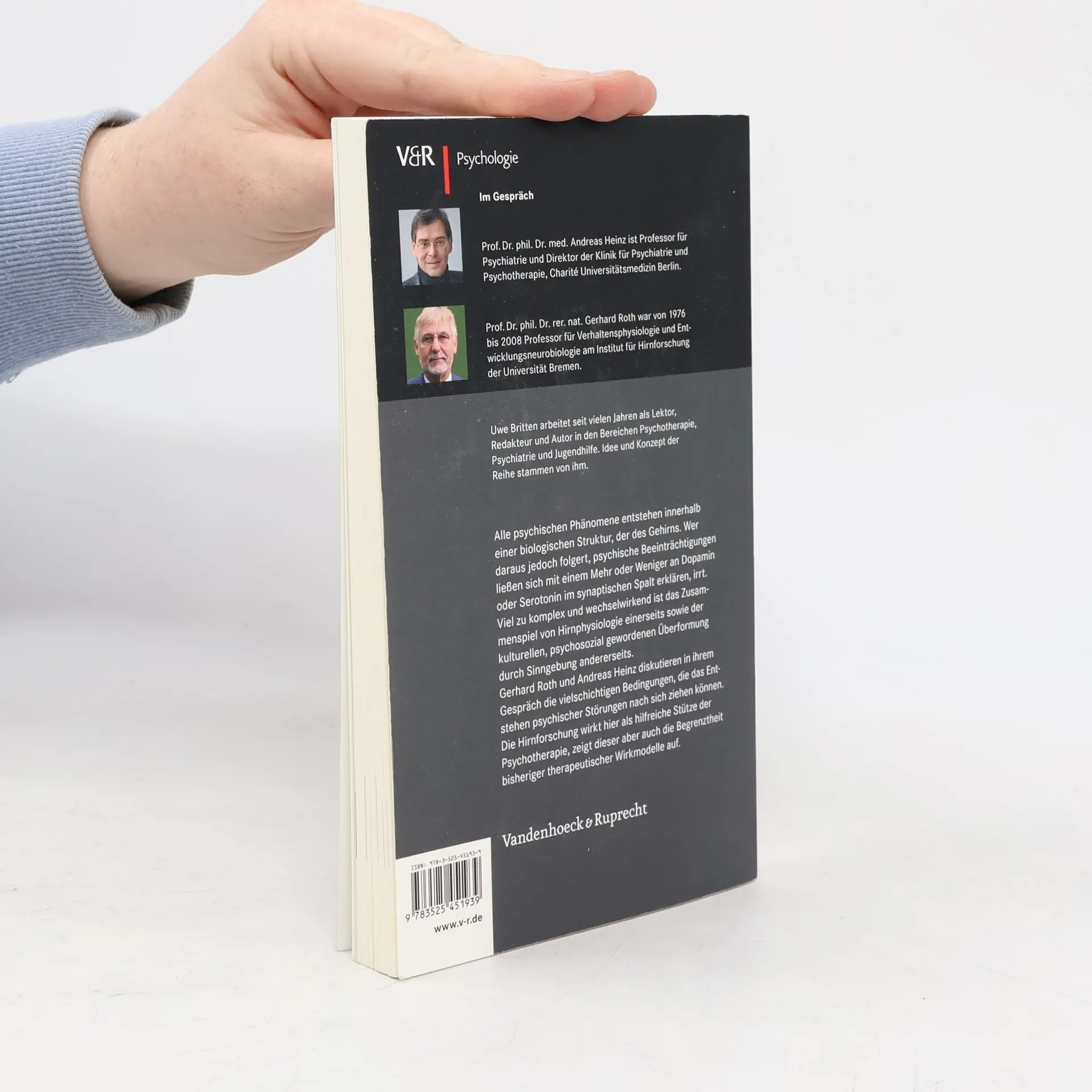Der Mensch ist ein biologisches Wesen. Damit entstehen auch alle psychischen Phänomene innerhalb einer biologischen Struktur, nämlich der des Gehirns. Wer daraus jedoch folgert, psychische Beeinträchtigungen ließen sich etwa mit einem Mehr oder Weniger an Dopamin oder Serotonin im synaptischen Spalt erklären, irrt, denn viel zu komplex und wechselwirkend ist die Funktionsweise der neuronalen Struktur, um sie mit einem schlichten »Wenn A, dann B« zu erklären. Hochkomplexe psychische Beeinträchtigungen und Erkrankungen resultieren zudem aus einer von Sinnfragen überlagerten inneren Auseinandersetzung des Menschen mit sich selbst. So werden sowohl reine Biologisten als auch jene Fachleute, die einen von neuronalen Abläufen unabhängigen menschlichen »Geist« propagieren, dem komplizierten Zusammenspiel von Hirnphysiologie einerseits sowie der kulturellen, also psychosozial gewordenen Überformung durch Sinngebung andererseits nicht gerecht. Gerhard Roth und Andreas Heinz diskutieren in ihrem Gespräch die vielschichtigen Bedingungen, die das Entstehen psychischer Störungen nach sich ziehen können. Die Hirnforschung wirkt hier als hilfreiche Stütze der Psychotherapie, zeigt dieser aber auch die Begrenztheit bisheriger therapeutischer Wirkmodelle auf.