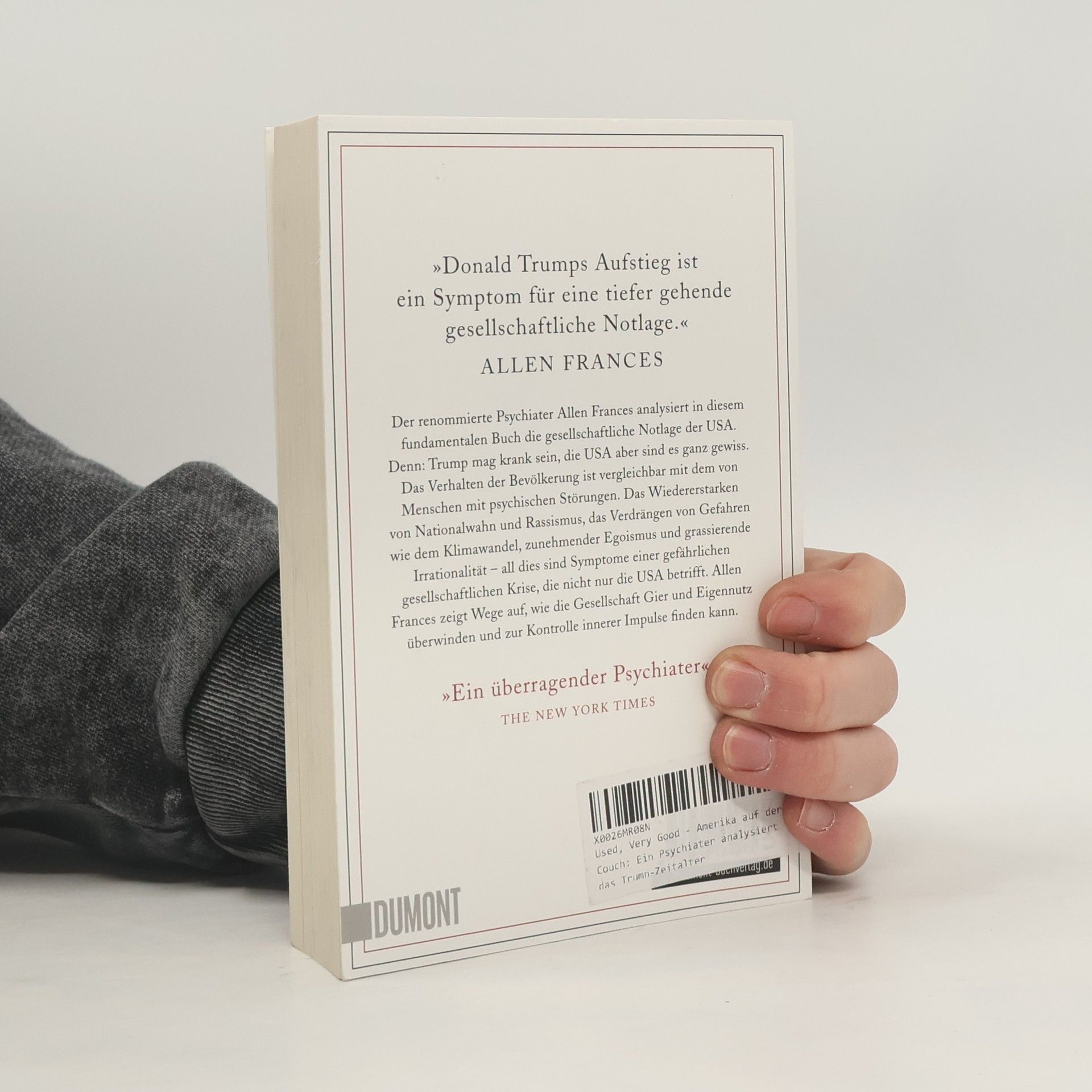 Sind wir am Ende der Aufklärung? Allen Frances warnt davor, die Wahl Trumps als Ausnahmefall oder Ausrutscher zu betrachten und nicht als Spiegelbild unserer Demokratie. Denn wir müssen uns mit der Frage beschäftigen, was seine Wahl über den Zustand der USA aussagt. In der Psychiatrie wird eine Wahnidee oder ein Irrglaube als eine tief sitzende, abwegige Überzeugung definiert. Und an genau solchen wahnhaften Überzeugungen hält die amerikanische Gesellschaft fest – genau wie viele andere westliche Gesellschaften. Lieber begegnen wir der bedrohlichen Realität mit Verleugnung, Wunschdenken und abwegigen Verhaltensweisen. Doch die Einsicht, dass wir uns selbst ein tiefes Loch graben, ist der erste und unerlässliche Schritt, um aus ihm herauszuklettern. Der Job eines Psychiaters ist es, Patienten zu helfen, aus ihren Fehlern zu lernen, das Irrationale ihres Denkens freizulegen und den Teufelskreis selbstzerstörerischen Verhaltens zu beenden. Diesen Heilungsprozess braucht nicht nur der Einzelne, sondern die gesamte westliche Welt. Denn wir müssen uns dem Wahnsinn in unserer Gesellschaft stellen bevor es zu spät ist. »Allen Frances argumentiert schlüssig, dass es deutlich dringender ist, die nationale Psyche zu entschlüsseln, als uns mit Debatten über Trumps geistigen Zustand abzulenken. Die viel wichtigere Frage ist: Was hat unsere Politik bis an diesen Punkt geführt?« THE NEW YORKER »Ein überragender Psychiater« THE NEW YORK TIMES