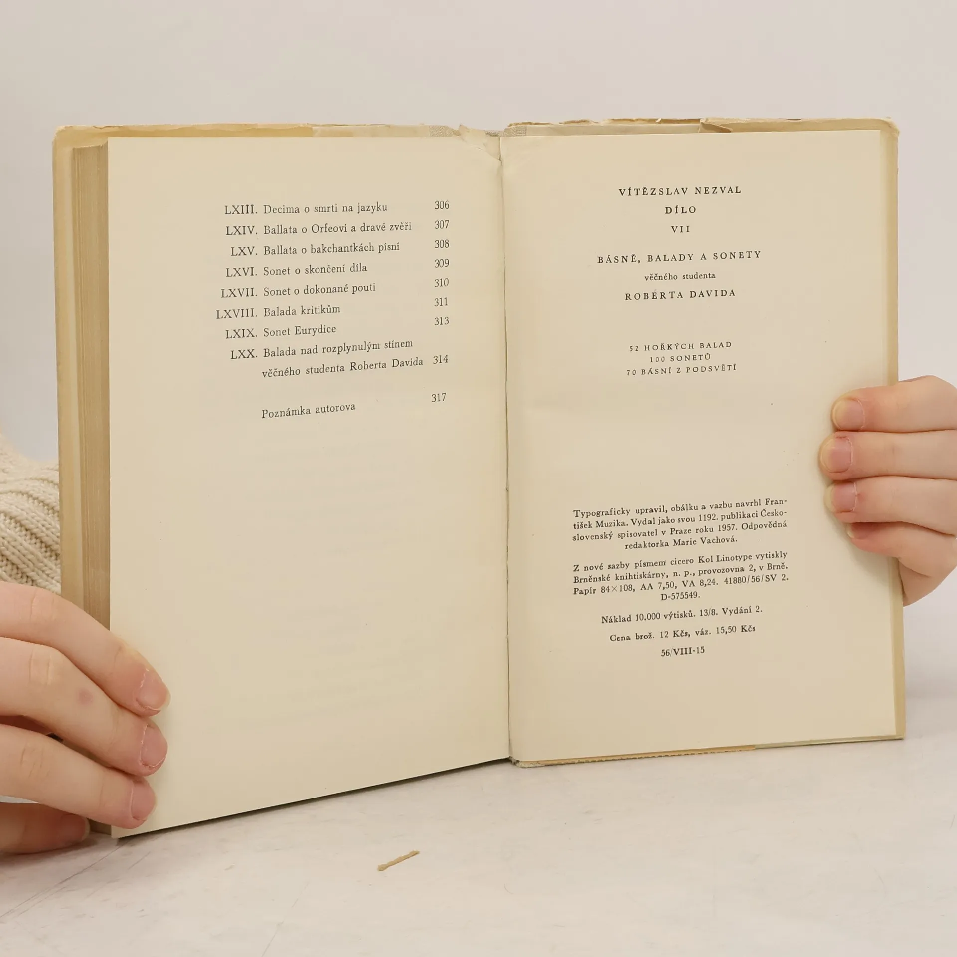 Kniha zahrnuje 3 svazky veršů (52 hořkých balad – 100 sonetů – 70 básní z podsvětí), které vyšly v letech 1935-1938 bez uvedení autorova jména. V doslovu osvětluje básník historii vydání veršů i nutnost, která si vynutila zrození této knihy s uvedením stati o díle, kterou napsal do Rudého práva 1936 Julius Fučík.