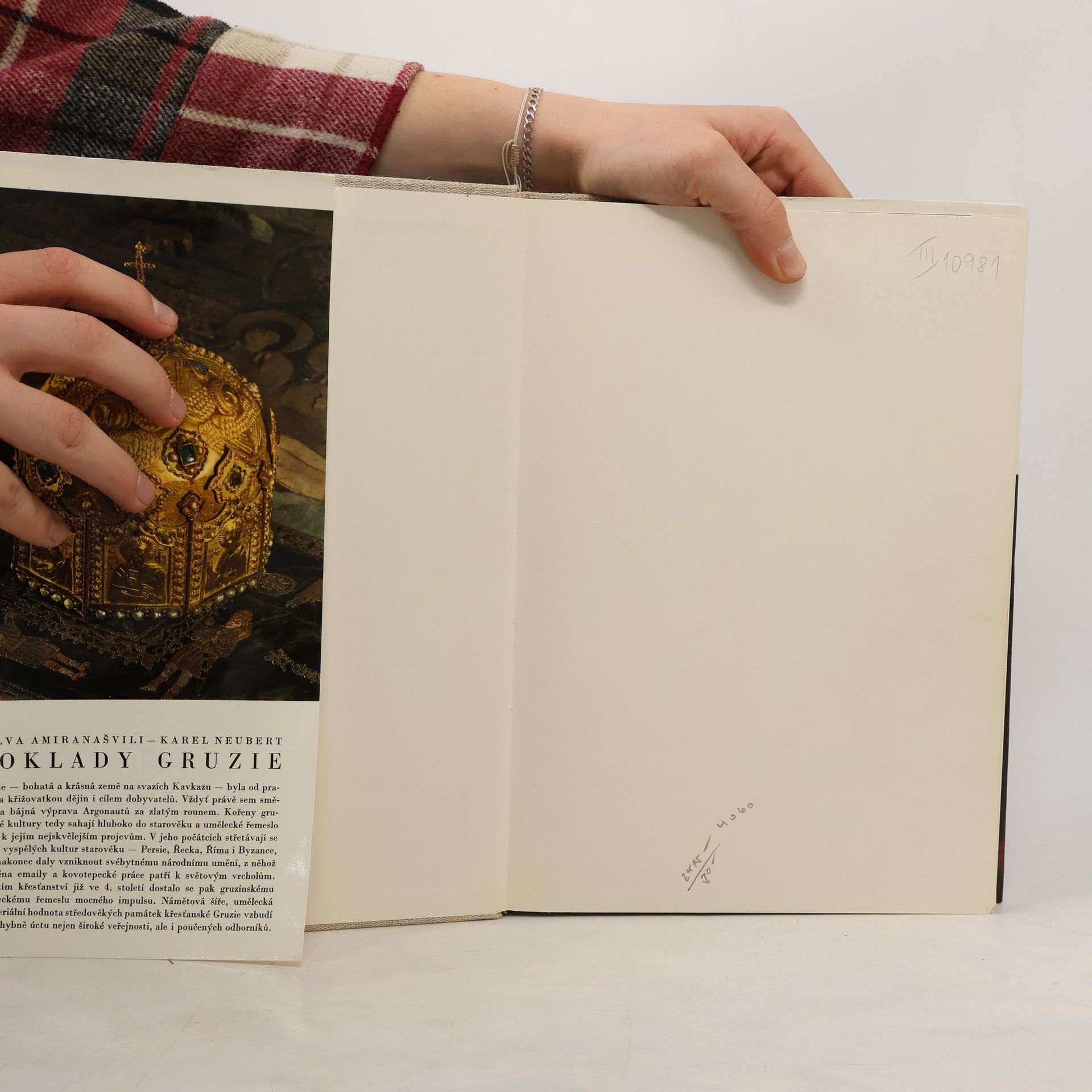 Jádro knihy tvoří 109 barevných fotografií, které zobrazují skvostné produkty gruzínského umění a uměleckého řemesla. Průvodní slovo čelného znalce se vztahuje přímo k reprodukcím a sleduje památky od 2. tisíciletí př. n. l.až k 18. století n. l., zahrnujíc dobu bronzovou, kolchidskoua ibero-meschskou kulturu, čas antických vlivů i díla křesťanské epochy. Krátká předmluva českého odborníka vytyčuje obecné historické souvislosti.