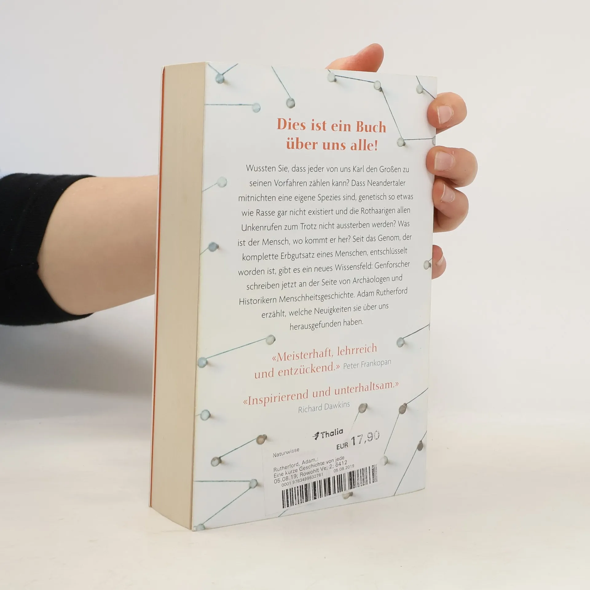 Wußten Sie, dass jeder von uns Karl den Großen zu seinen Vorfahren zählen kann? Dass Neandertaler mitnichten eine eigene Spezies sind, genetisch so etwas wie Rasse gar nicht existiert und die Rothaarigen allen Unkenrufen zum Trotz nicht aussterben werden? Wo kommen wir her? Was ist der Mensch? Seit das Genom, der komplette Erbgut-Satz eines Menschen, hunderttausendfach entschlüsselt («sequenziert») worden ist, erobert die Genforschung immer weitere Felder. Das Neueste: Weil unserem Genom auch die Evolution unserer Spezies eingeschrieben ist, schreiben Genforscher jetzt an der Seite von Archäologen und Historikern auch Menschheitsgeschichte. Sie haben dabei überraschende Erkewnntnisse gewonnen. Und manches Wissen von gestern erweist sich als Mythos, zumal inzwischen auch das Genmaterial sehr alter Knochenfunde «zum Sprechen» gebracht werden kann. Ein Science-Schmöker für jedermann, der sich für dieses neue Wissensfeld interessiert, zugleich gibt der Autor eine beiläufige Einführung für jedermann in die Vererbungslehre. 150 Jahre nach Darwin gibt Rutherford einen ausgezeichneten Überblick darüber, was wir inzwischen wissen können und auch darüber, was wir eben nicht wissen.