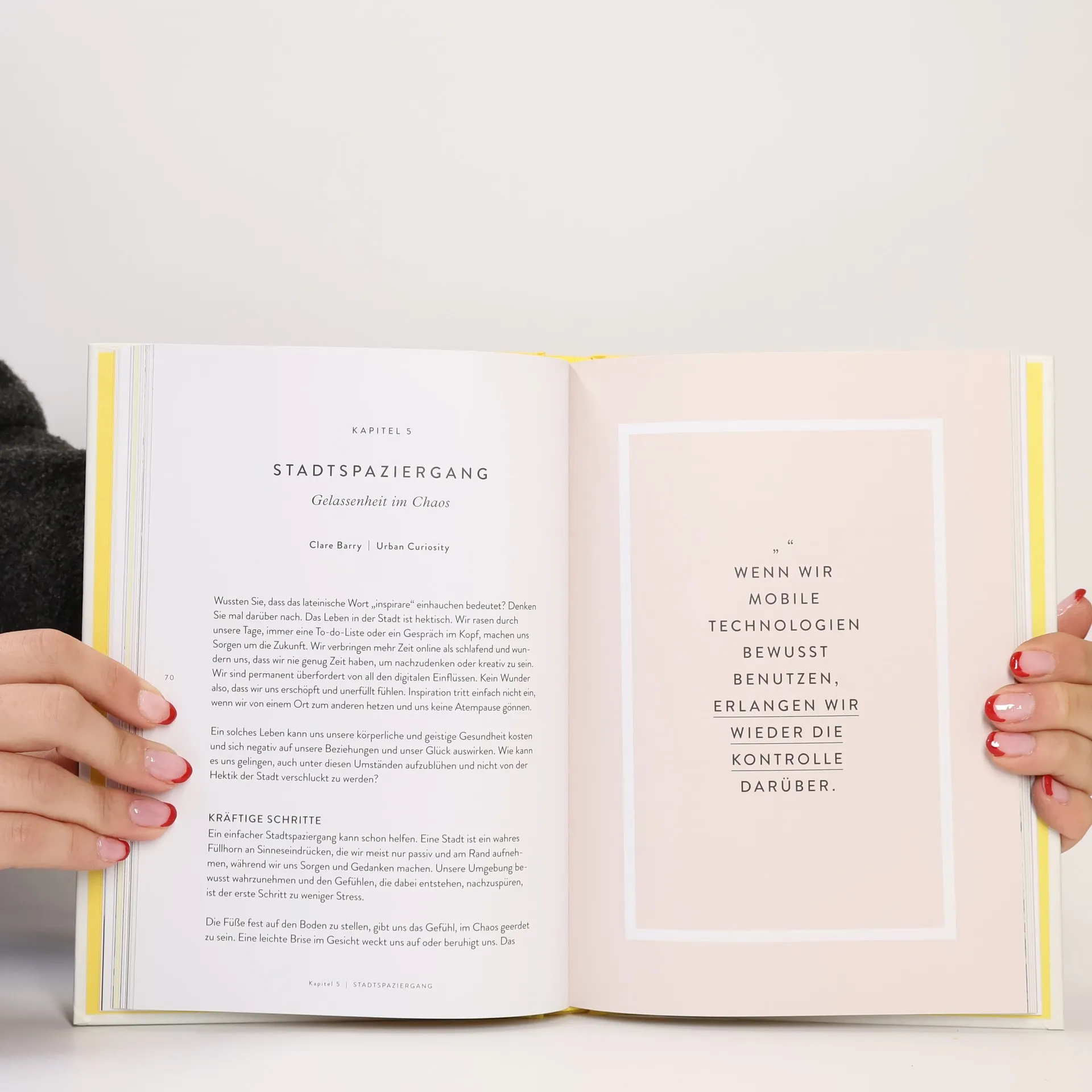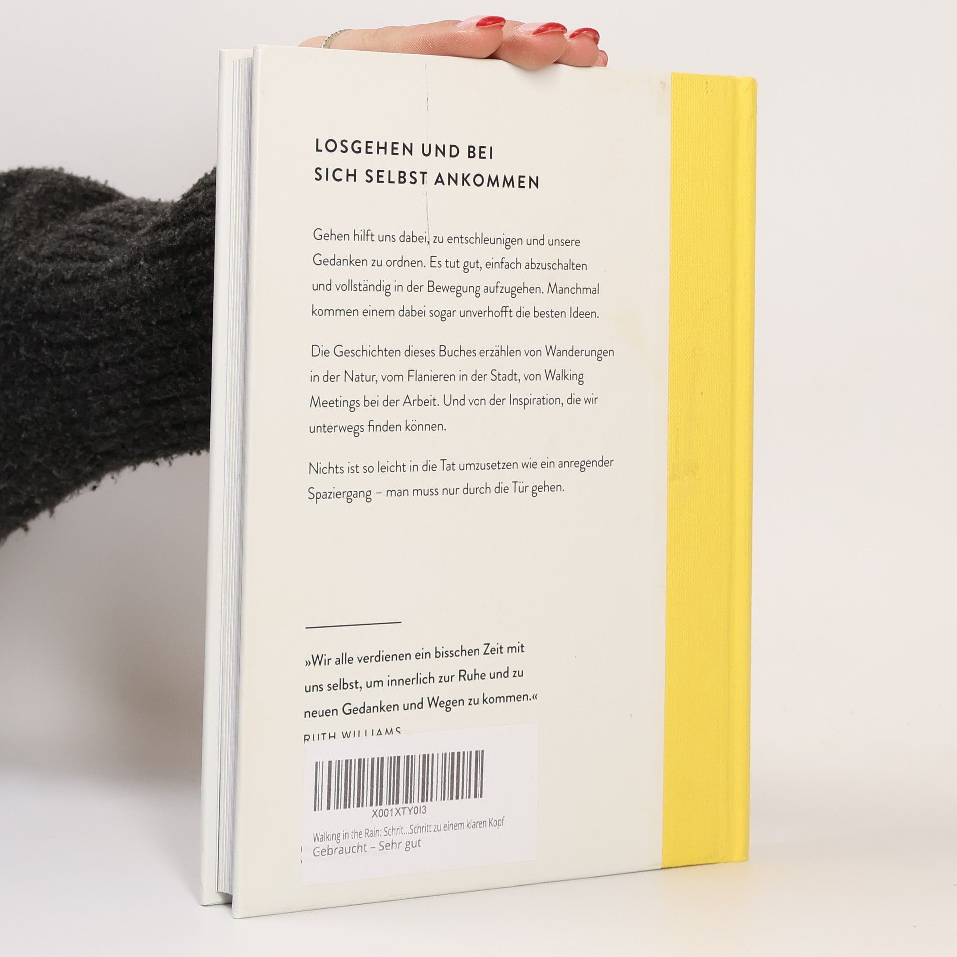 Beim Gehen kommen einem oft die besten Ideen. Es hilft uns zu entschleunigen, unsere Gedanken zu ordnen und Situationen aus einer anderen Perspektive zu betrachten. Manchmal tut es aber auch gut, einfach abzuschalten und vollständig in der Bewegung aufzugehen. Oder die Aufmerksamkeit auf andere Dinge zu richten: die Farben, die einen umgeben; den Untergrund, auf dem man sich bewegt; die eigenen Schritte. ›Walking in the Rain‹ versammelt zehn Geschichten von Künstlern, Designern, Autoren und Psychologen, die in ihren regelmäßigen Spaziergängen Inspiration finden. Sie berichten von Wanderungen in der Natur, vom Flanieren in der Stadt, von bewegenden Begegnungen beim Pilgern und von Walking-Meetings bei der Arbeit. In jedem Kapitel finden sich Ideen und Anregungen, die dabei helfen, tägliche Routinen und einen eigenen Rhythmus zu entwickeln. Nichts ist so leicht in die Tat umzusetzen wie ein Spaziergang – man muss nur durch die Tür gehen. »Wir alle verdienen ein bisschen Zeit mit uns selbst, um innerlich zur Ruhe und zu neuen Gedanken und Wegen zu kommen.« RUTH WILLIAMS, DEPT. STORE FOR THE MIND