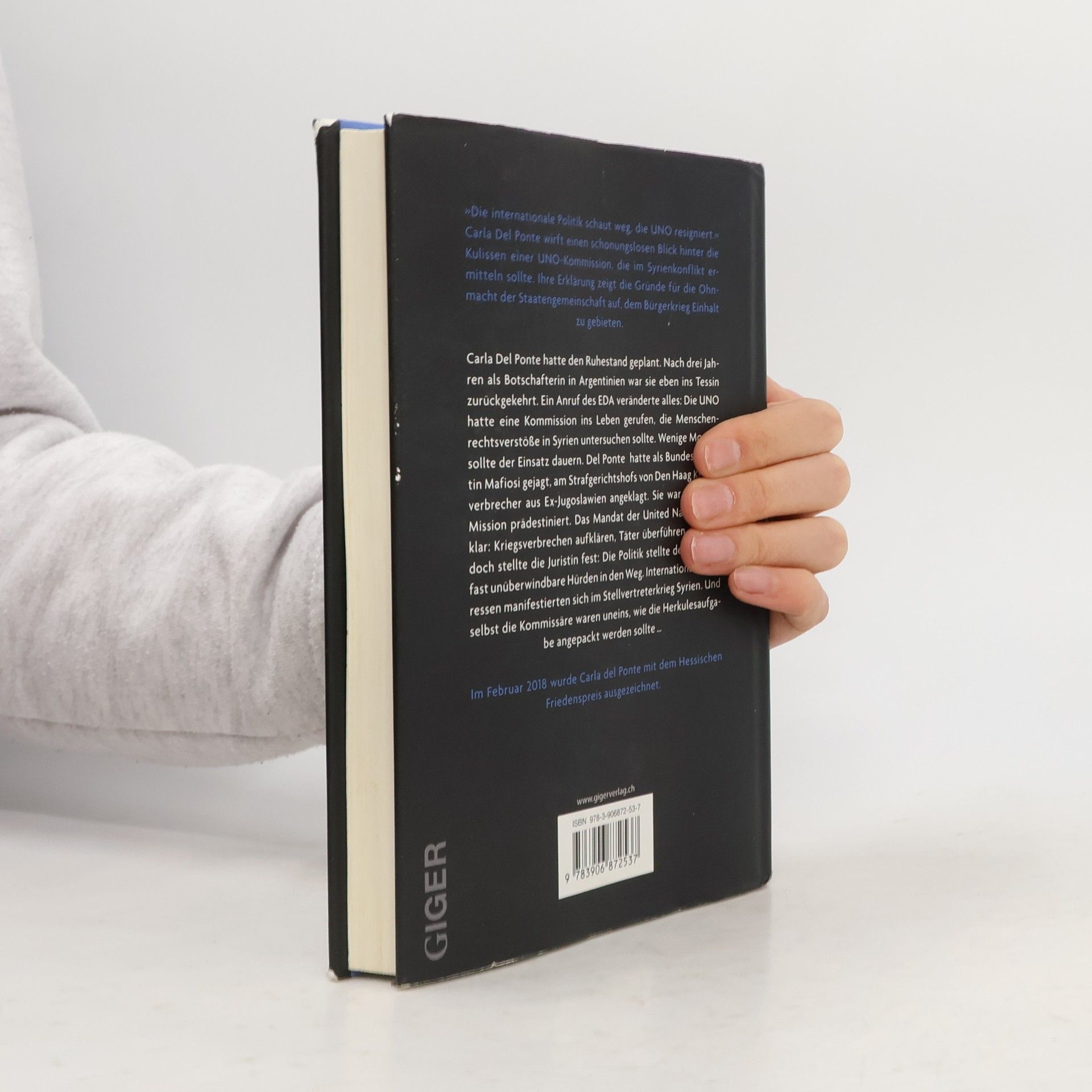 Dieses Buch ist ein unerschrockenes Statement im Namen der Opfer über den einsamen und verzweifelten Kampf von Carla del Ponte für Menschenrechte und für den Frieden. Im Oktober 2017 gab Carla del Ponte überraschend ihren Rücktritt als UNO-Sonderberichterstatterin von Syrien bekannt. Die frühere UNO-Chefanklägerin Carla del Ponte wirft der internationalen Gemeinschaft im Syrienkonflikt kollektives Versagen vor. Gräueltaten, wie etwa jene der Terrororganisation IS, habe sie zuvor noch nie gesehen, nicht in Jugoslawien, nicht in Ruanda. »Syrien ist ein Land ohne Zukunft. Sie zerstören alles, was irgendwie menschlich ist. Es ist unfassbar. Es gibt keine Schulen mehr, nur noch wenige Spitäler, kaum etwas zu essen und keine Institutionen. So schlimme Verbrechen wie in Syrien begangen werden, habe ich weder in Ruanda noch in Ex-Jugoslawien gesehen. Die Regierung Assad, die schreckliche Verbrechen gegen die Menschlichkeit verübt und Chemiewaffen einsetzt. Doch keiner hilft. Die internationale Politik schaut weg und die UNO resigniert«, so del Ponte. Carla del Ponte erzählt schonungslos über das Gemetzel im Nahen Osten, ihre Besuche in den Flüchtlingscamps, die Gespräche mit den Regierungen der USA, Russland, Türkei und der UN, die verpasste Chance auf Frieden sowie das fehlende Wollen und die Unfähigkeit der internationalen Staatengemeinschaft (UN) und der Politik. Carla del Ponte erhält im Frühjahr 2018 den hessischen Friedenspreis.