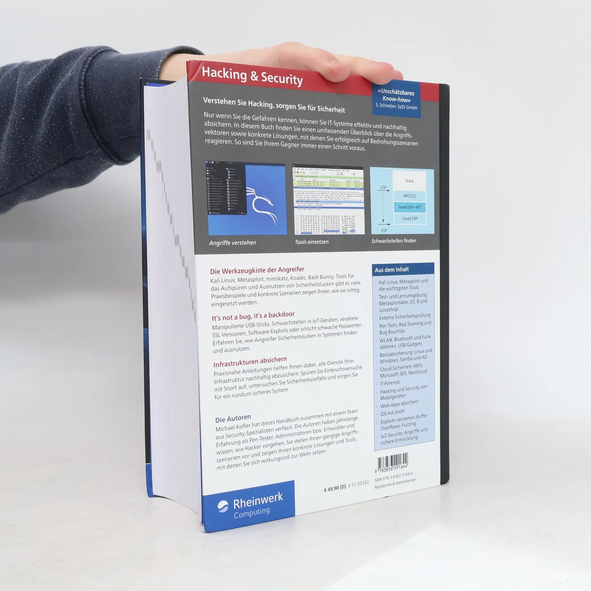IT-Security und Hacking sind zwei Seiten einer Medaille – wer das eine verstehen will, muss auch das andere kennen. Machen Sie sich also mit den wichtigsten Werkzeugen vertraut und verstehen Sie die Hintergründe der Bedrohungsszenarien aus dem Netz. Von der Absicherung des Active Directory bis zum Einsatz von Kali Linux, von der Suche nach Exploits bis zur Härtung von Webservern: Ein Team renommierter IT-Sicherheitsexperten zeigt Ihnen, wie Sie Ihre Infrastrukturen nachhaltig absichern und Angreifern einen Schritt voraus sind. Aus dem Inhalt: Kali Linux Hacking-Tools (nmap, hydra, Metasploit, OpenVas) Externe Sicherheitsüberprüfung Penetration Testing (Client und Server) Basisabsicherung: Linux und Windows, Active Directory und Samba Cloud-Sicherheit: AWS, NextCloud, Office 365 Hacking und Security von Smartphones Web-Anwendungen absichern und angreifen Exploits: Buffer Overflows, Fuzzing, Heap Spraying und mehr IoT-Geräte und -Infrastruktur