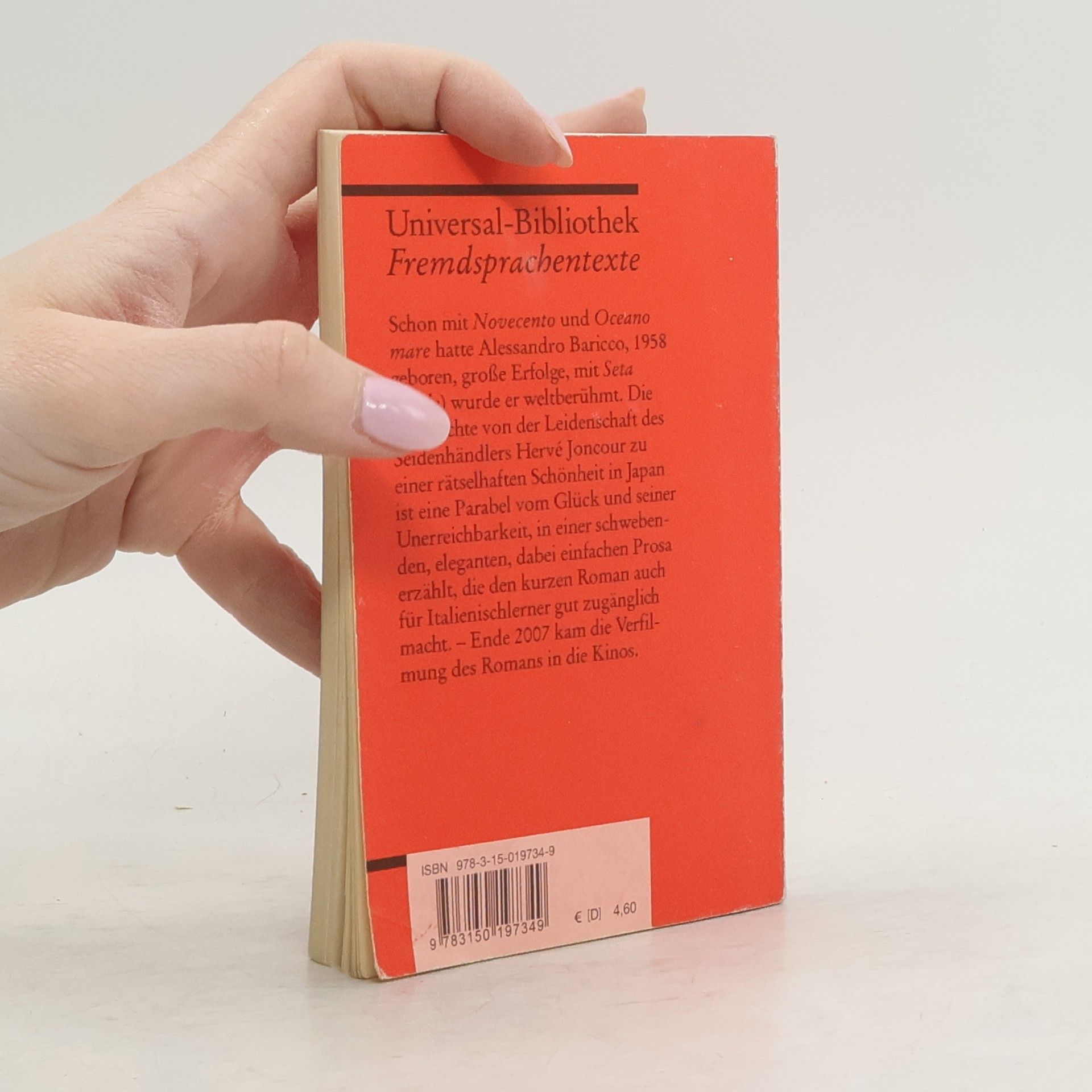 Italienische Literatur in Reclams Roter Reihe: das ist der italienische Originaltext – ungekürzt und unbearbeitet mit Worterklärungen am Fuß jeder Seite, Nachwort und Literaturhinweisen. Schon mit seinen ersten Romanen hatte der 1958 geborene Alessandro Baricco große Erfolge, mit „Seta“ (dt. „Seide“) wurde er weltberühmt. Die Geschichte von der Leidenschaft des Seidenhändlers Hervé Joncour zu einer rätselhaften Schönheit in Japan erzählt Baricco in einer schwebenden, eleganten, dabei einfachen Prosa („leicht wie ein Seidentuch“, Elke Heidenreich), die den kurzen Roman für Italienischlerner schon mit guten Grundkenntnissen zugänglich macht – eine Parabel vom Glück und seiner Unerreichbarkeit. Im Herbst 2007 kam die Verfilmung des Romans in die Kinos. Italienische Lektüre: Niveau B1 (GER) Sprachen: Italienisch, Deutsch