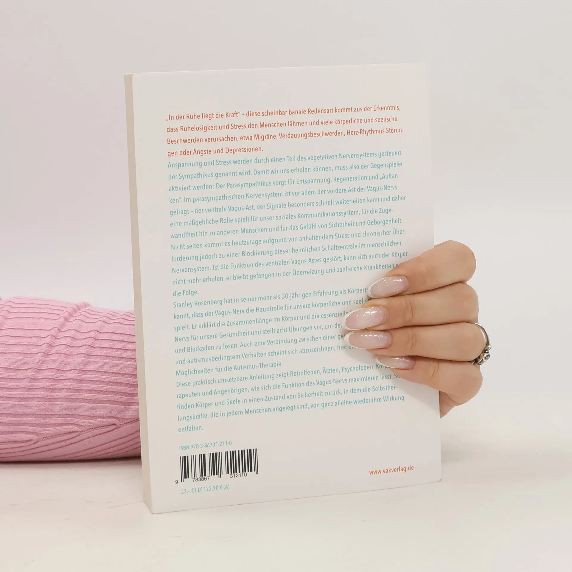 „In der Ruhe liegt die Kraft“ – diese Redensart verdeutlicht, dass Ruhelosigkeit und Stress lähmend wirken und zahlreiche körperliche sowie seelische Beschwerden verursachen können, wie Migräne, Verdauungsprobleme oder Ängste. Der Sympathikus, ein Teil des vegetativen Nervensystems, steuert Anspannung und Stress. Um Erholung zu ermöglichen, muss der Parasympathikus aktiviert werden, der für Entspannung und Regeneration sorgt. Besonders der ventrale Vagusnerv spielt eine zentrale Rolle, da er Signale schnell weiterleitet und für soziale Kommunikation sowie ein Gefühl von Sicherheit verantwortlich ist. Heutzutage führt anhaltender Stress oft zu Blockaden in diesem Nervensystem, was die Erholung des Körpers beeinträchtigt und zu verschiedenen Krankheiten führt. Stanley Rosenberg, ein erfahrener Körpertherapeut, zeigt die essenzielle Bedeutung des Vagusnervs für unsere Gesundheit auf und präsentiert acht Übungen zur Aktivierung und Lösung von Blockaden. Zudem wird eine Verbindung zwischen einer gestörten Vagusfunktion und autismusbedingtem Verhalten thematisiert, was neue Ansätze für die Autismus-Therapie eröffnet. Diese praktische Anleitung richtet sich an Betroffene, Ärzte, Psychologen und Therapeuten und hilft, die Funktion des Vagusnervs zu maximieren, sodass Körper und Seele in einen Zustand von Sicherheit zurückfinden, in dem Selbstheilungskräfte wieder aktiv werden können.