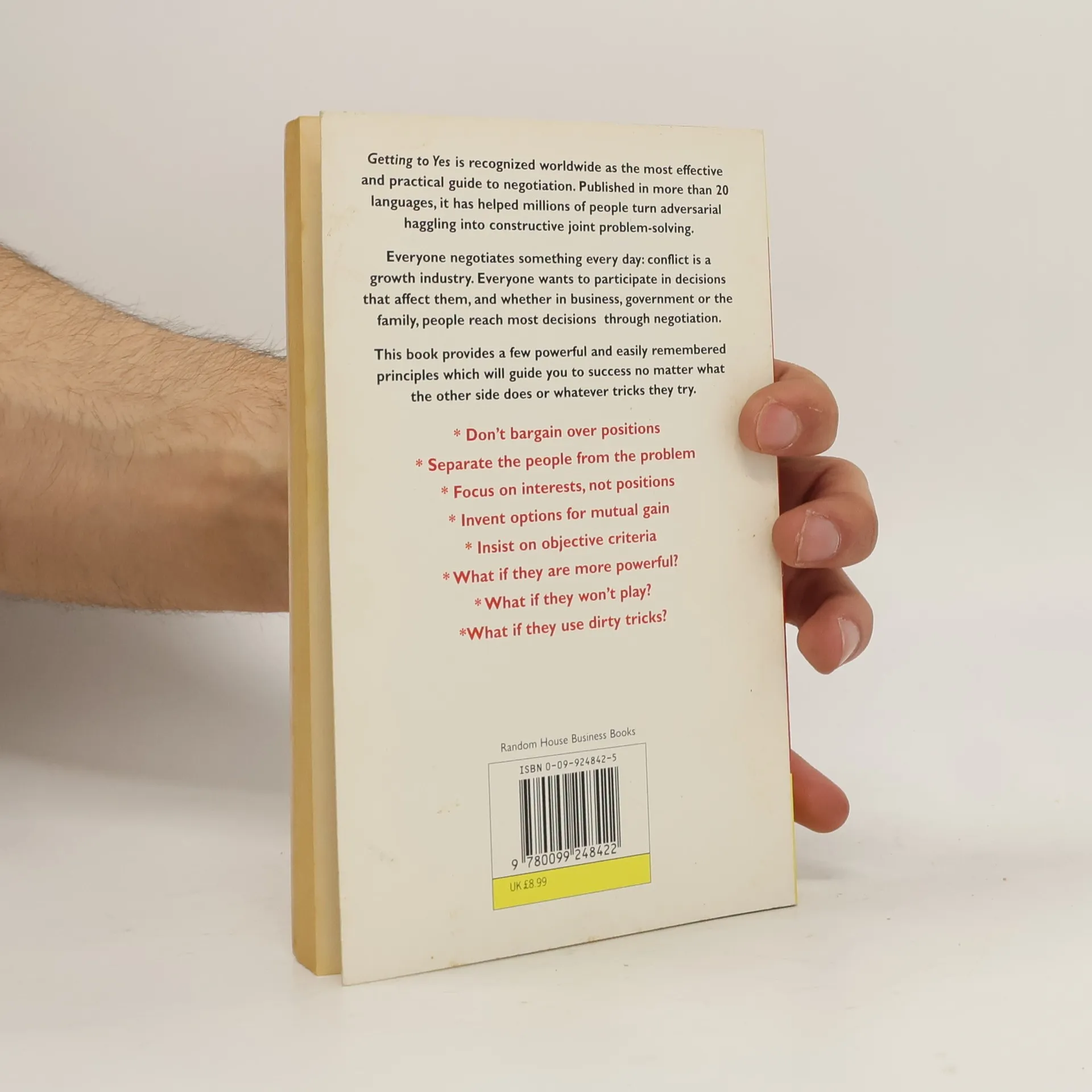 Getting to Yes je skvělá kniha o vyjednávání, která ukazuje, proč je poziční vyjednávání neefektivní a jak místo toho vést kreativní diskusi. Obě strany hledají společné zájmy a řešení, která pomůžou oběma. Praktická, plná užitečných rad.