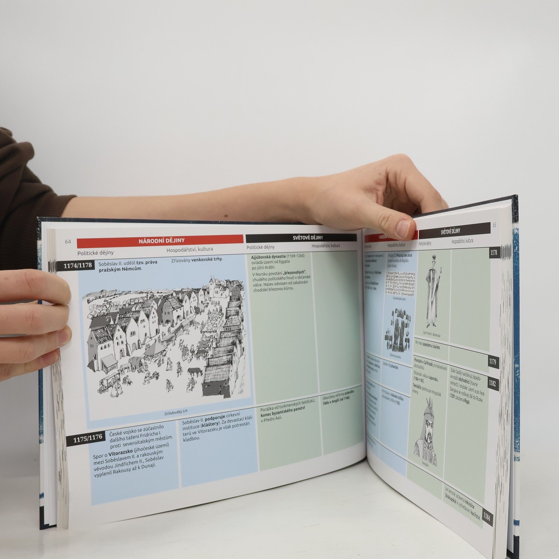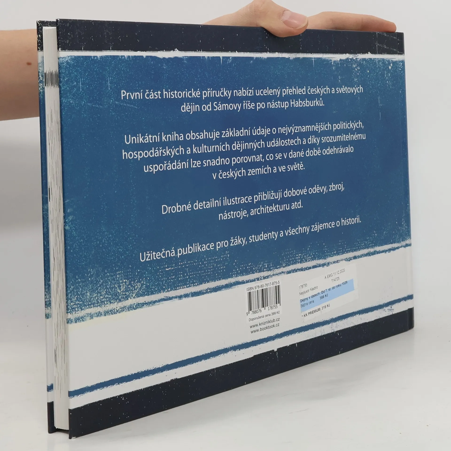 První díl historické příručky nabízí ucelený přehled českých a světových dějin od Sámovy říše po nástup Habsburků. Unikátní kniha obsahuje základní údaje o nejvýznamnějších politických, hospodářských a kulturních dějinných událostech, a díky srozumitelnému uspořádání lze snadno porovnat, co se v dané době odehrávalo v českých zemích a ve světě. Drobné detailní ilustrace přibližují dobové oděvy, zbroj, nástroje, architekturu atd. Užitečná publikace pro žáky, studenty a všechny zájemce o historii.
