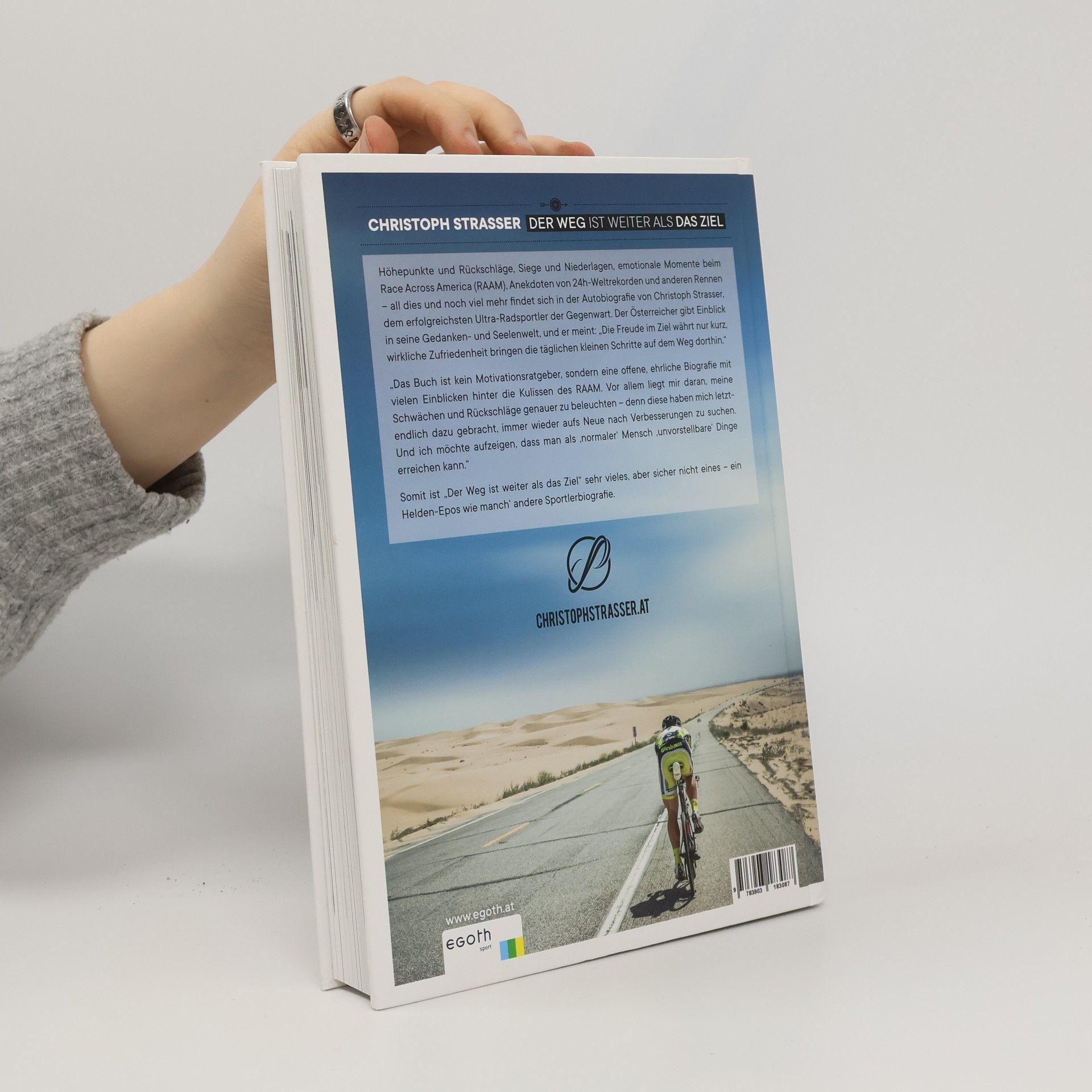 Christoph Strasser ist der erfolgreichste Ultra-Radsportler der Gegenwart, unter anderem mehrfacher Gewinner des Race Across America und weiterer Nonstop-Rennen sowie 24-Stunden-Weltrekordhalter. Mit diesem Werk legt der Steirer eine ausführliche Autobiographie vor, in der er seine Anfänge als Radsportler beschreibt, aber auch Einblick in seine Gedanken- und Seelenwelt gibt. Die Freude im Ziel währt nur kurz, meint Strasser, wirkliche Zufriedenheit bringen die täglichen kleinen Schritte am Weg dorthin. „Das Buch ist kein Motivationsratgeber, sondern eine offene, ehrliche Autobiographie mit vielen Einblicken hinter die Kulissen des RAAM. Ich gebe in diesem Werk auch sehr viel Persönliches preis, vor allem liegt mir daran, meine Schwächen und Rückschläge genauer zu beleuchten – denn diese haben mich letztendlich dazu gebracht, immer wieder aufs Neue nach Verbesserungen zu suchen. Rückschläge lehren jedoch auch Demut und bewahren vor Höhenflügen, ein wesentlicher und wichtiger Faktor. Es wird also kein Buch einem Helden-Epos gleich, wie manch‘ andere Sportlerbiografien, sondern ein authentischer Einblick hinter die Fassade. Mir liegt daran, zu zeigen dass man als „normaler“ Mensch diese „unvorstellbaren“ Dinge erreichen kann."
