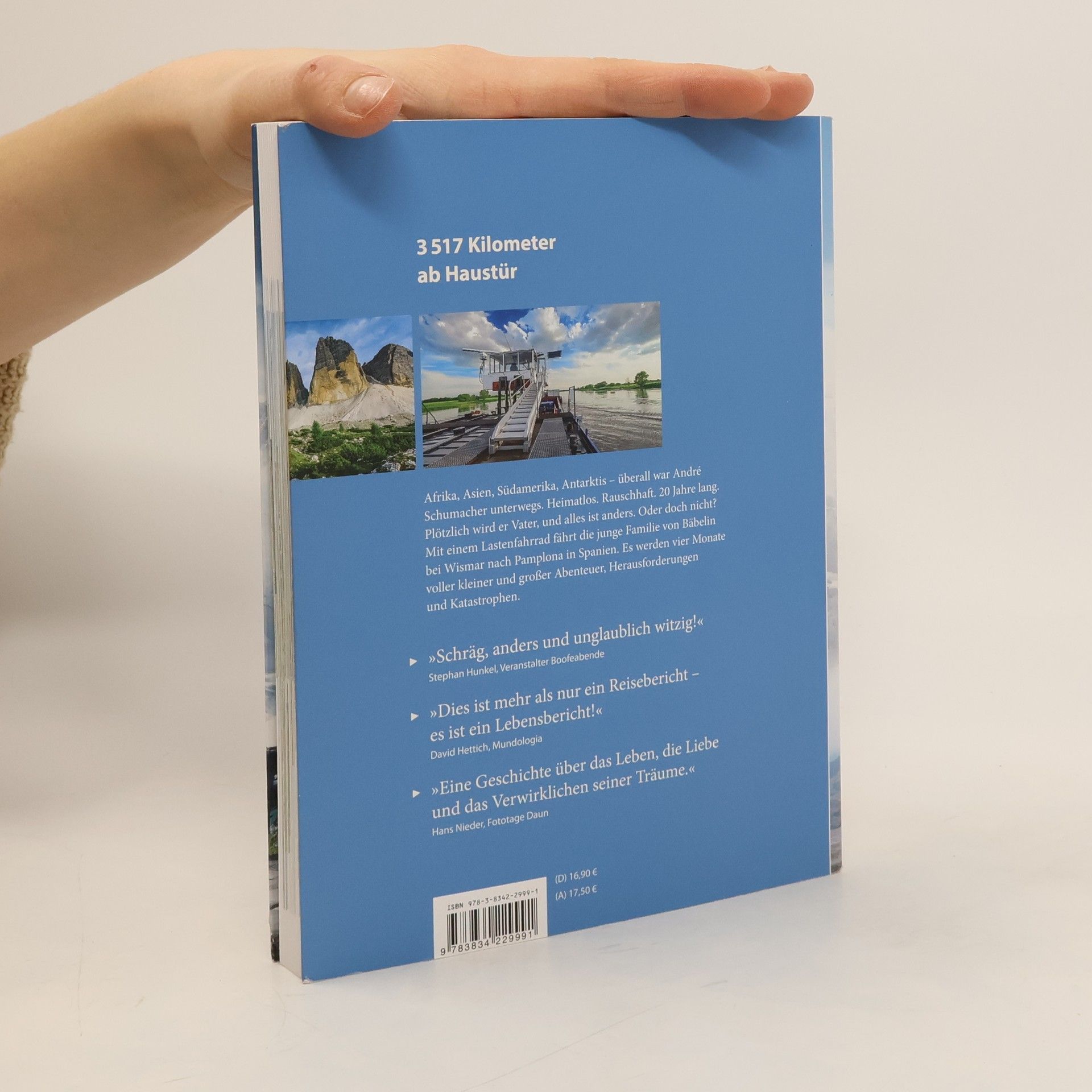 André Schumacher ist ein Besessener. Auf der ganzen Welt war er unterwegs. Heimatlos. Rauschhaft. Süchtig nach der Ferne, nach Menschen, nach Geschichten. Plötzlich wird er Vater , und alles ist anders. Oder doch nicht? Mit einem Lastenfahrrad fährt die junge Familie von Bäbelin bei Wismar nach Pamplona in Spanien. Ihr Weg führt sie die Elbe und Moldau hinauf in den Böhmerwald, durch Salzkammergut, Hohe Tauern und das Weltnaturerbe der Dolomiten, entlang der Oberitalienischen Seen, durch die Genussregionen Piemont und Provence, über die Cevennen und die Pyrenäen bis ins Baskenland. Was die drei dabei erleben? Alles! Hitzewellen und Schneestürme, Spinner und Visionäre, unbeschreibliche Strapazen und Momente größten Glücks . André Schumacher erzählt mit viel Humor und wunderbaren Bildern die Geschichte dieser außergewöhnlichen Reise . Sein Buch ist ein Ratgeber für Langzeitreisende und Europahungrige, eine Inspirationsquelle für Familien und ein Mutmacher für ewige Träumer „Schräg, anders und unglaublich witzig!“ Stephan Hunkel, Veranstalter Boofeabende „Dies ist mehr als nur ein Reisebericht – es ist ein Lebensbericht!“ David Hettich, Mundologia „Eine Geschichte über das Leben, die Liebe und das Verwirklichen seiner Träume.“ Hans Nieder, Fototage Daun