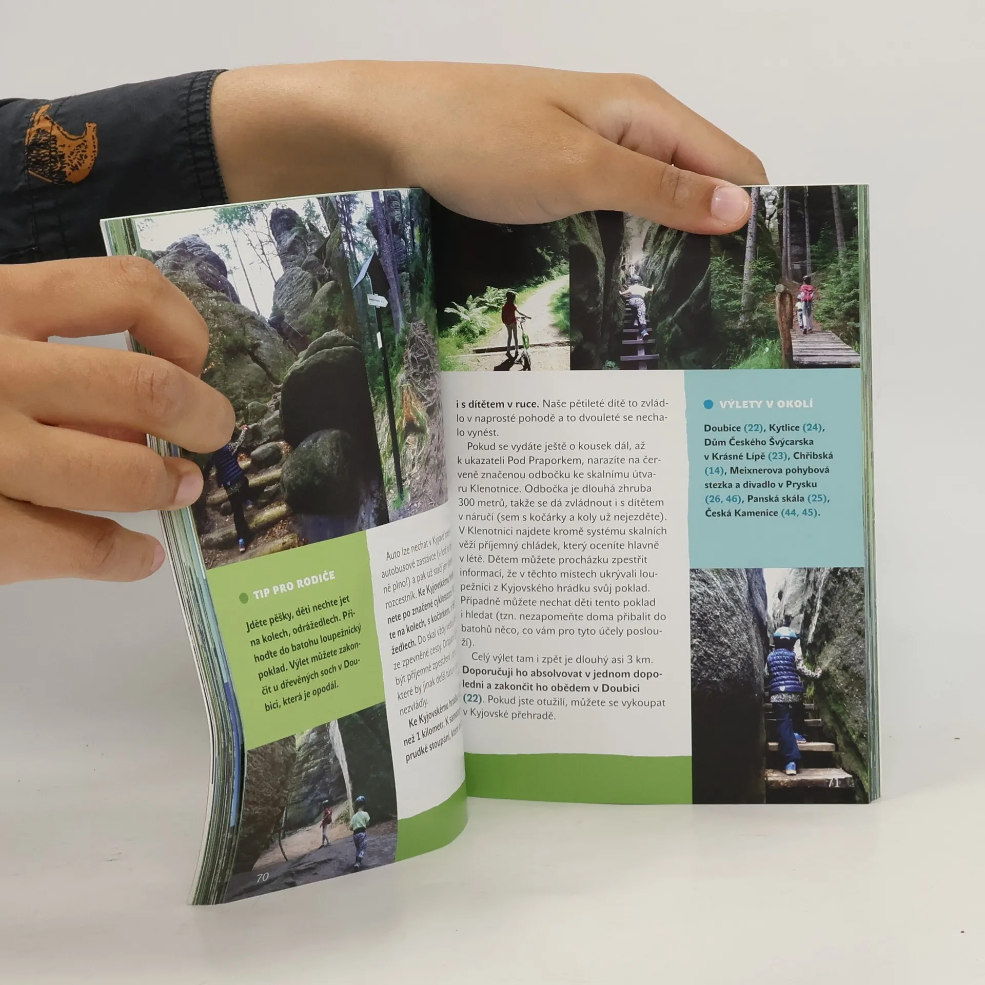 Poctivě prochozený průvodce nádherným krajem Českosaského Švýcarska a jeho okolí. Výlety zde nejsou o zdolávání desítek km s děťátkem v krosně na zádech nebo ve vozíku za kolem. Kniha zahrnuje pečlivě vybrané a autorčinými malými dětmi otestované trasy, které zvládne i ten nejmenší začínající turista. Najdete v něm ten správný mix tras vhodných pro kočárky a tras krátkých tak akorát pro malé nožičky. Výlety jsou koncipovány tak, aby se v nich potkávala určitá dávka té správné turistiky a zároveň zábavy pro děti. Zkrátka tak, aby si každý z rodiny přišel na své. Kniha obsahuje 136 stran a více než 40 výletních tipů zahrnujících trasy vhodné pro kočárky, odrážedla či pro krátkou pěší turistiku.