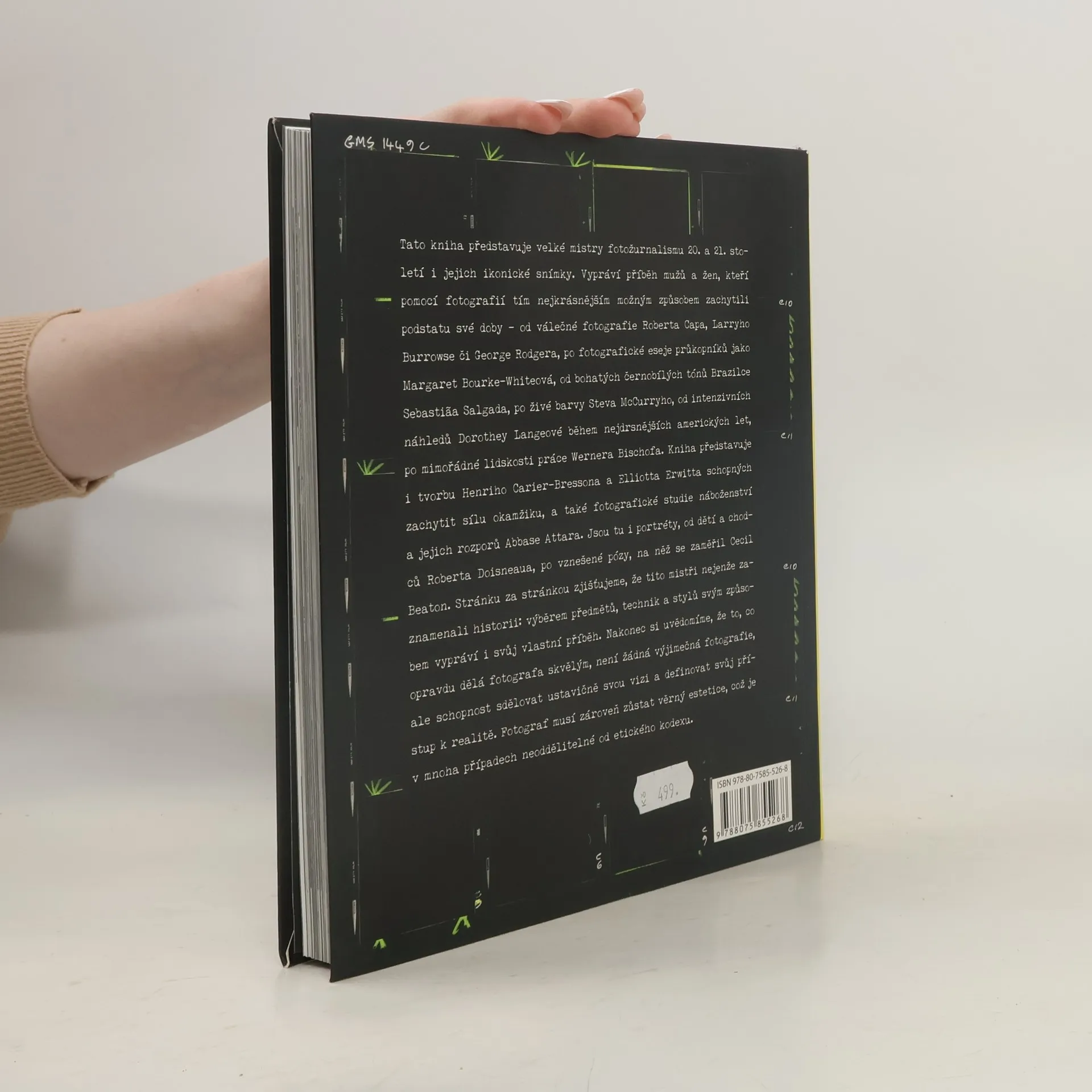 Tato kniha představuje velké mistry fotožurnalismu 20. a 21. Století i jejich ikonické snímky. Vypráví příběh mužů a žen, kteří pomocí fotografií tím nejkrásnějším možným způsobem zachytili podstatu své doby – od válečné fotografie Roberta Capa, Larryho Burrowse či George Rodgera, po fotografické eseje průkopníků jako Margaret Bourke-Whiteová, od bohatých černobílých tónů Brazilce Sebastia~a Salgada, po živé barvy Steva McCurryho, od intenzivních náhledů Dorothey Langeové během nejdrsnějších amerických let, po mimořádné lidskosti práce Wernera Bischofa. Kniha představuje i tvorbu Henriho Carier-Bressona a Elliotta Erwitta schopných zachytit sílu okamžiku, a také fotografické studie náboženství a jejich rozporů Abbase Attara. Jsou tu i portréty, od dětí a chodců Roberta Doisneaua, po vznešené pózy, na něž se zaměřil Cecil Beaton. Stránku za stránkou zjišťujeme, že tito mistři nejenže zaznamenali historii: výběrem předmětů, technik a stylů svým způsobem vypráví i svůj vlastní příběh. Nakonec si uvědomíme, že to, co opravdu dělá fotografa skvělým, není žádná výjimečná fotografie, ale schopnost sdělovat ustavičně svou vizi a definovat svůj přístup k realitě. Fotograf musí zároveň zůstat věrný estetice, což je v mnoha případech neoddělitelné od etického kodexu.