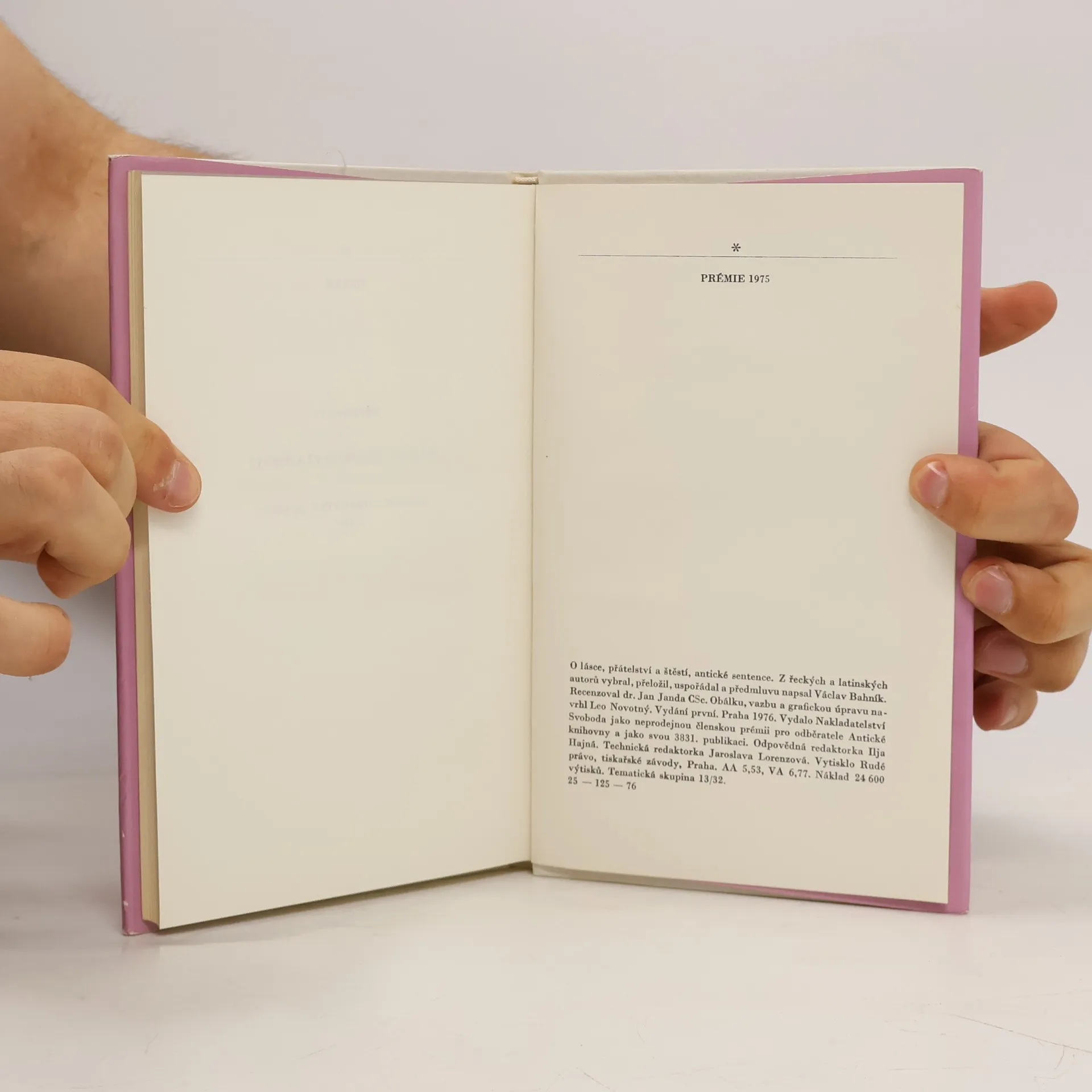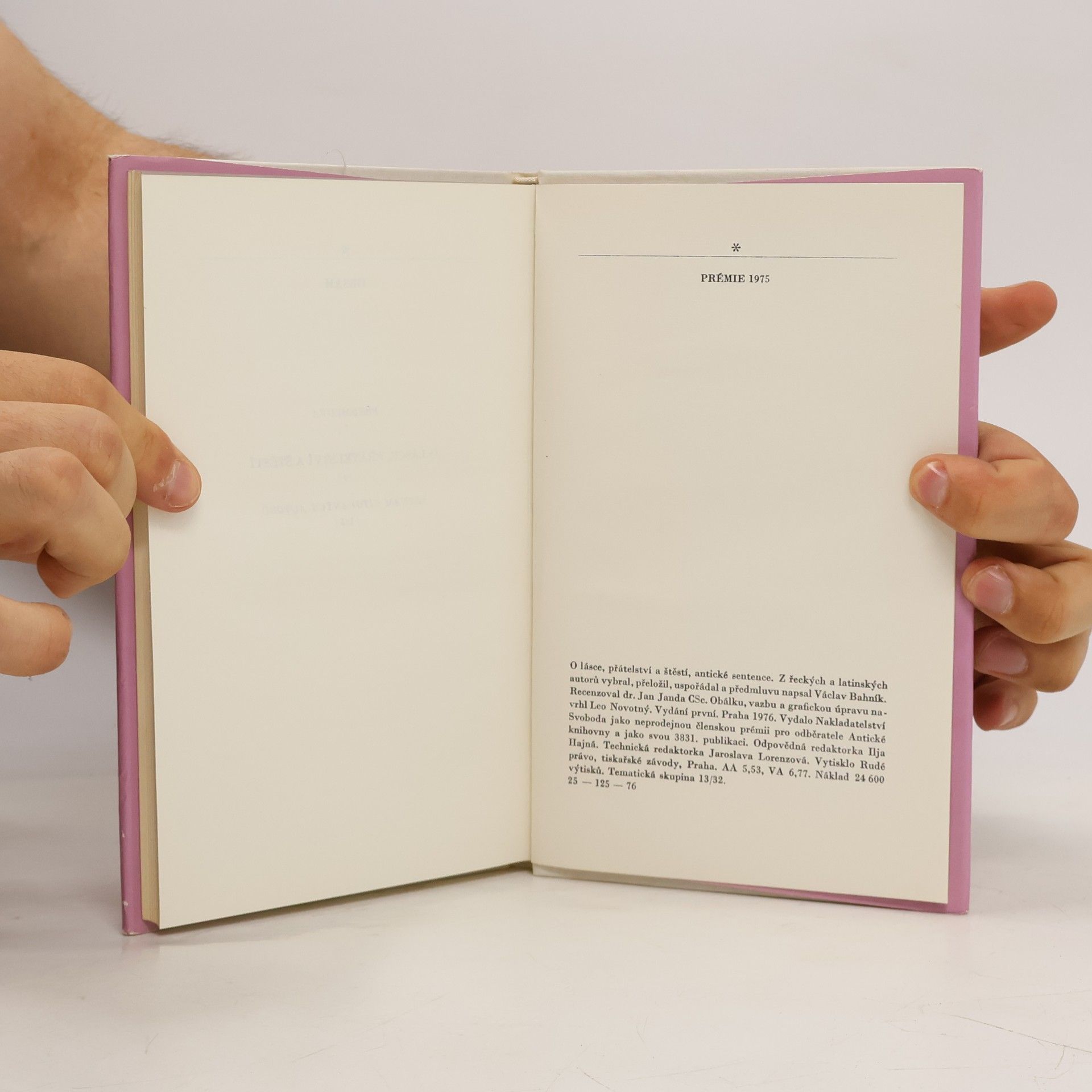 Antické sentence. Předmluva: Již staří Římané dělali to a ono - to bývalo zaklínadlo, které někdy pomáhalo omlouvat jednání, jehož správností si člověk nebyl jist, jindy varovalo před domýšlivou hrdostí na originalitu současné doby, jindy upozorňovalo na hodnoty všelidské a všečasové. Vybrali jsme pro vás z bohaté pokladnice antické literatury hrst příkladů, jak již staří Římané (a před nimi staří Řekové) dovedli vidět světlo a stín vzdělání, dobré i špatné vlastnosti člověka a různé aspekty vztahů mezi lidmi a formulovali mnohé pocity stejně jako lidé dvacátého (jednadvacátého) století. ... Přestože žijeme ve světě úplně jiném, některé myšlenky nás udivý tím, že byly formulovány tak, že mají platnost dodnes, i když se dnešní čtenář nemůže do písmene se vším ztotožnit, vše přejímat jako vidění světe. Václav Bahník Je to kniha plná citátů a přísloví.