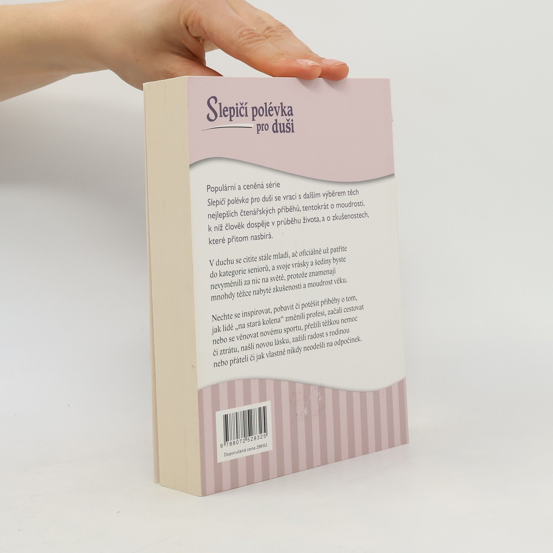 Populární a ceněná série Slepičí polévka pro duši se vrací s dalším výběrem těch nejlepších čtenářských příběhů, tentokrát o moudrosti, k níž člověk dospěje v průběhu života, a o zkušenostech, které přitom nasbírá. V duchu se cítíte stále mladí, ač oficiálně už patříte do kategorie seniorů, a svoje vrásky a šediny byste nevyměnili za nic na světě, protože znamenají mnohdy těžce nabyté zkušenosti a moudrost věku. Nechte se inspirovat, pobavit či potěšit příběhy o tom, jak lidé "na stará kolena" změnili profesi, začali cestovat nebo se věnovat novému sportu, přežili těžkou nemoc či ztrátu, našli novou lásku, zažili radost s rodinou nebo přáteli či jak vlastně nikdy neodešli na odpočinek.
