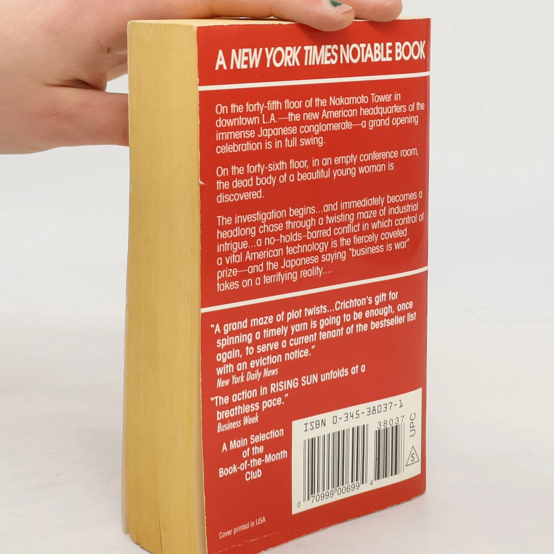 On the forty-fifth floor of the Nakamoto Tower in downtown L.A.—the new American headquarters of the immense Japanese conglomerate—a grand opening celebration is in full swing. On the forty-sixth floor, in an empty conference room, the dead body of a beautiful young woman is discovered. The investigation begins ... and immediately becomes a headlong chase through a twisting maze of industrial intrigue ... a no-holds-barred conflict in which control of a vital American technology is the fiercely coveted prize—and the Japanese saying "business is war" takes on a terrifying reality ... --back cover