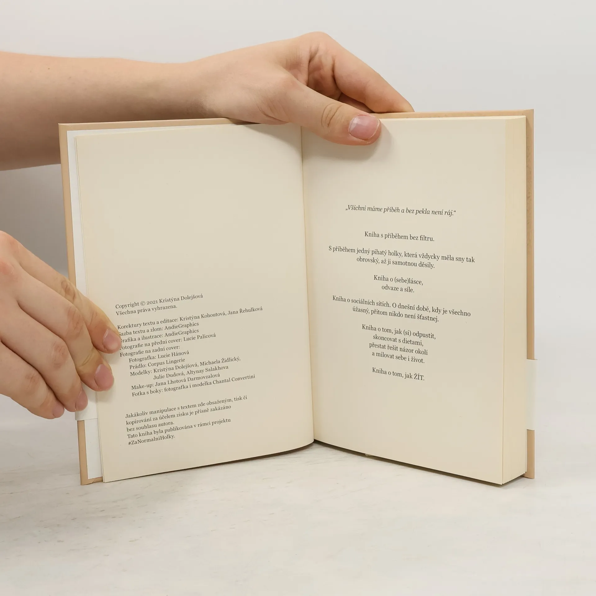 O ČEM JE KNIHA BEZ FILTRU? Knihu BEZ FILTRU jsem napsala já, Kristýna Dolejšová, autorka projektu #ZaNormalniHolky. Co na vás v knize čeká? Můj osobní příběh. O mém dětství, závislosti na sladkém, neustálých dietách, toxickém vztahu a mnohem víc. Jak a proč vzniknul projekt #ZaNormalniHolky Výsledky anonymního dotazníku o těle a sebevědomí, jenž vyplnilo přes 5000 dívek Odpovědi na vašich 50 nejčastějších otázek Sociální sítě a jejich vliv na sebedůvěru dětí Kyberšikana, sexting a bezpečnost na internetu Sebeláska - co to je a proč ji praktikovat Tři zásadní způsoby, jak praktikovat sebelásku Vztah k jídlu a jak ho zahojit Mých 13 osobních hodnot, které mi vždy pomohou odpustit si a vrátit se do hry Skutečný rozhovor mezi mnou a jednou čtenářkou Perličky z projektu WORKBOOK - 30 stran připravených na Tvou kreativní energii a (znovu)objevení ženskosti