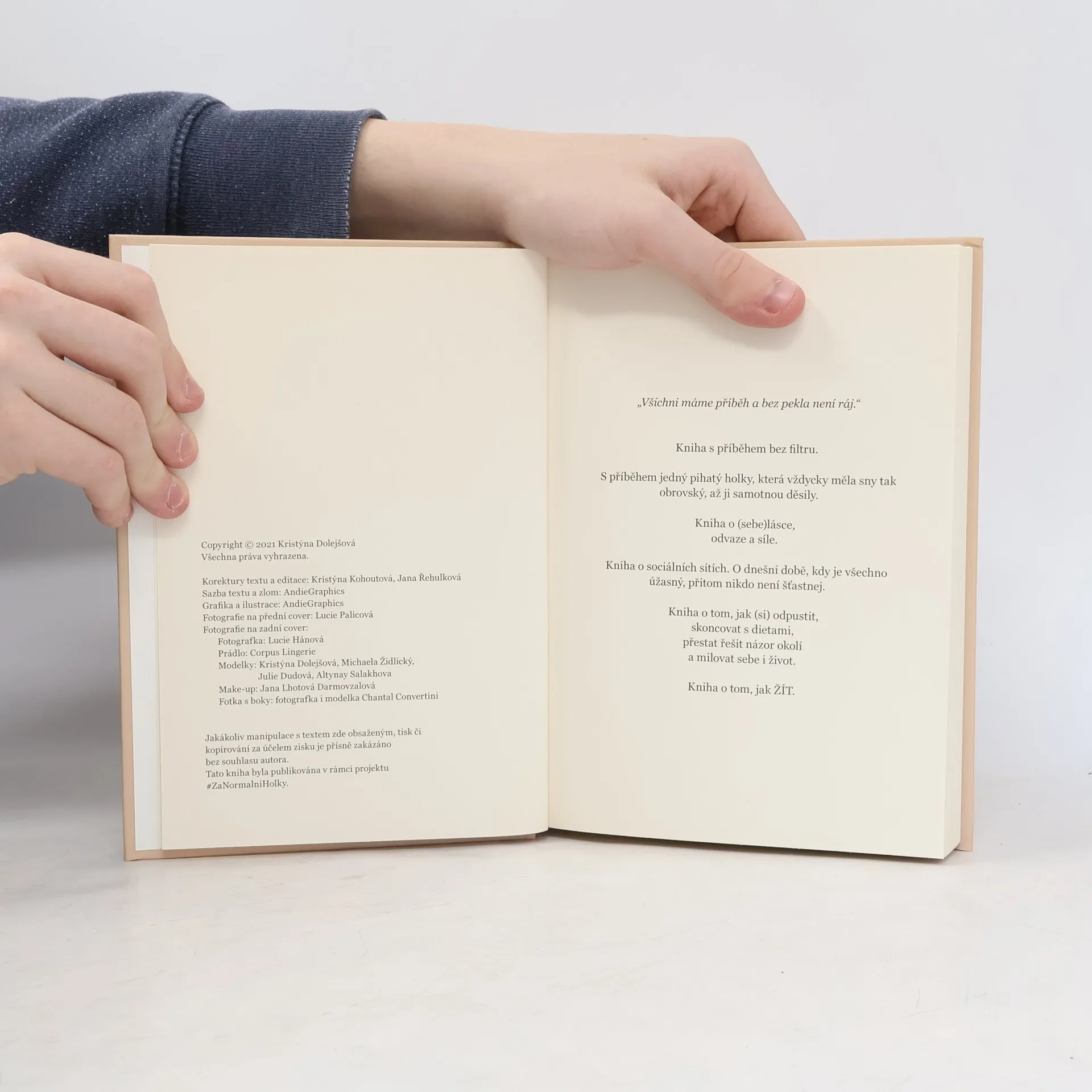 O ČEM JE KNIHA BEZ FILTRU? Knihu BEZ FILTRU jsem napsala já, Kristýna Dolejšová, autorka projektu #ZaNormalniHolky. Co na vás v knize čeká? Můj osobní příběh. O mém dětství, závislosti na sladkém, neustálých dietách, toxickém vztahu a mnohem víc. Jak a proč vzniknul projekt #ZaNormalniHolky Výsledky anonymního dotazníku o těle a sebevědomí, jenž vyplnilo přes 5000 dívek Odpovědi na vašich 50 nejčastějších otázek Sociální sítě a jejich vliv na sebedůvěru dětí Kyberšikana, sexting a bezpečnost na internetu Sebeláska - co to je a proč ji praktikovat Tři zásadní způsoby, jak praktikovat sebelásku Vztah k jídlu a jak ho zahojit Mých 13 osobních hodnot, které mi vždy pomohou odpustit si a vrátit se do hry Skutečný rozhovor mezi mnou a jednou čtenářkou Perličky z projektu WORKBOOK - 30 stran připravených na Tvou kreativní energii a (znovu)objevení ženskosti