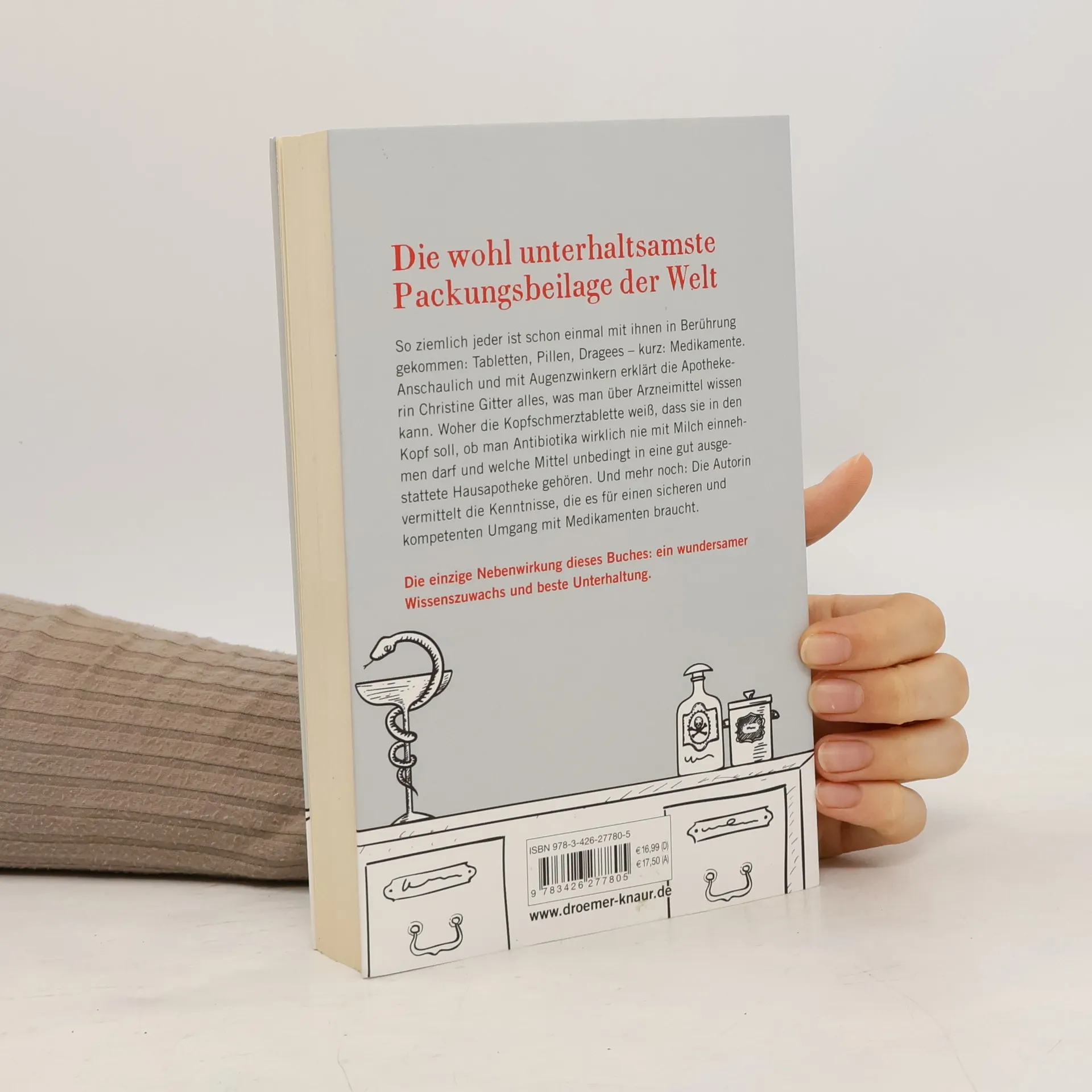 Medikamente sind für uns Helfer in der Not, manchmal lebensnotwendig, sie bergen aber auch Risiken und Nebenwirkungen für unsere Gesundheit. Anschaulich und charmant erzählt Apothekerin Christine Gitter alles, was man wissen muss, um sich im Dickicht der Pharmazie sicher zu bewegen. Die Pharmazeutin Christine Gitter kennt sie ganz genau: die Fragen und Sorgen all jener, die eine Apotheke aufsuchen. Wie soll man es schaffen, eine riesige Kapsel zu schlucken? Woher weiß die Kopfschmerz-Tablette, dass sie in den Kopf soll und: Gibt es diese Pille auch vegan? Jetzt hat sie ihr gesammeltes Apotheken-Wissen aufgeschrieben. • Anschaulich und mit Augenzwinkern erklärt sie komplexe Zusammenhänge, • zeigt einfache Tricks • und teilt ihr Rezept für die perfekte Hausapotheke. Und mehr noch: Christine Gitter vermittelt das Wissen, das es für einen sicheren und kompetenten Umgang mit Medikamenten braucht. Die einzige Nebenwirkung dieses Buches: ein wundersamer Wissenszuwachs und beste Unterhaltung.