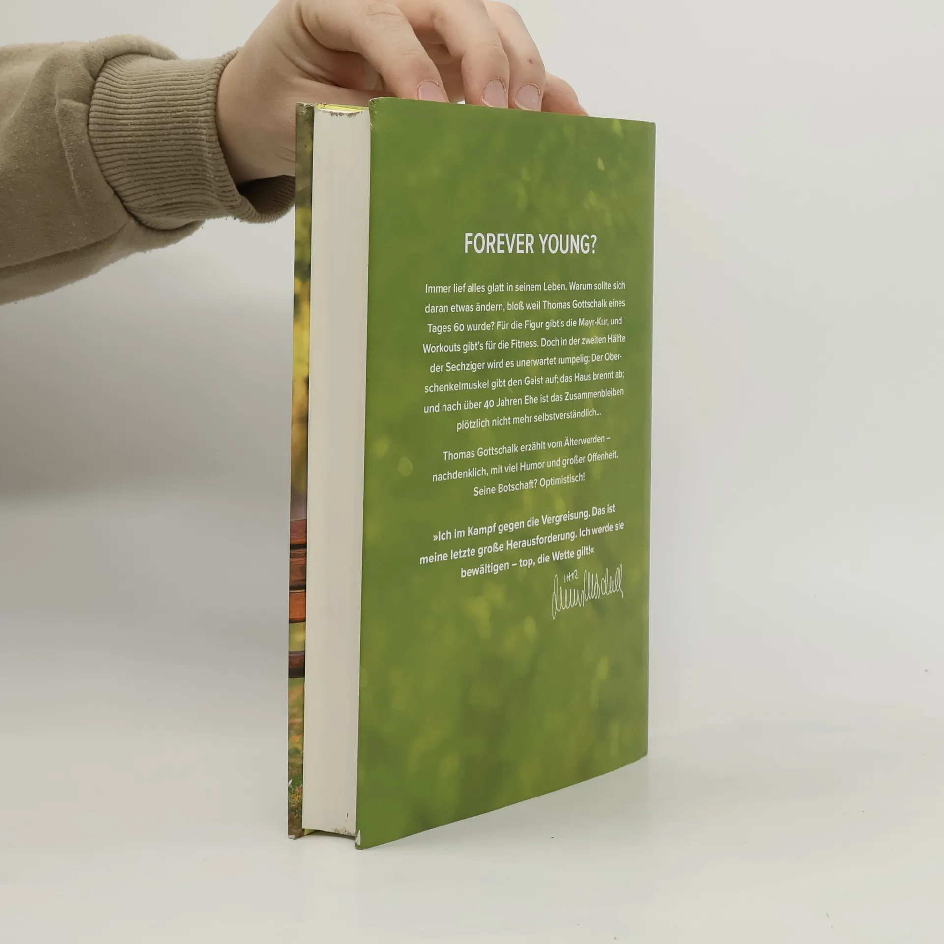 Forever young? Immer lief alles glatt in seinem Leben. Warum sollte sich daran etwas ändern, bloß weil Thomas Gottschalk eines Tages 60 wurde? Für die Figur gibt’s die Mayr-Kur, und Workouts gibt’s für die Fitness. Doch in der zweiten Hälfte der Sechziger wird es unerwartet rumpelig: Der Oberschenkelmuskel gibt den Geist auf; das Haus brennt ab; und nach über 40 Jahren Ehe ist das Zusammenbleiben plötzlich nicht mehr selbstverständlich… Thomas Gottschalk erzählt vom Älterwerden – nachdenklich, mit viel Humor und großer Offenheit. Seine Botschaft? Optimistisch! »Ich im Kampf gegen die Vergreisung. Das ist meine letzte große Herausforderung. Ich werde sie bewältigen – top, die Wette gilt!« Thomas Gottschalk