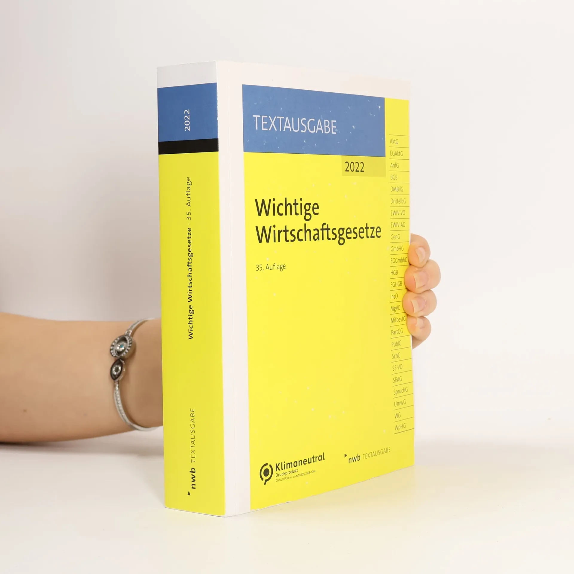 Alle wichtigen Wirtschaftsgesetze in einem Band. Die 32. Auflage der „Wichtigen Wirtschaftsgesetze“ ist eine unverzichtbare Arbeitshilfe für Praxis und Studium. Diese kompakte und aktuelle NWB Textausgabe vereint alle benötigten Wirtschaftsgesetze. Die praktische Griffleiste, Paragraphenzuordnung, nicht amtliche Satzzählung und die Hervorhebung inhaltlicher Änderungen erleichtern die Nutzung der Gesetzessammlung. Als Lehrausgabe erfüllt sie die Anforderungen der meisten Prüfungsordnungen. Zusätzliche Services wie kostenlose Aktualisierungen der Inhalte im Internet sowie in der App „NWB Gesetze“ machen dieses Werk besonders nützlich und verlässlich. Stand dieser Ausgabe: 1. Januar 2019. Inhaltsverzeichnis: I. Handelsgesetzbuch (HGB). II. Einführungsgesetz zum Handelsgesetzbuch (EGHGB). III. Bürgerliches Gesetzbuch (BGB) – Auszug. IV. Aktiengesetz (AktG). V. Einführungsgesetz zum Aktiengesetz (EGAktG). VI. Gesetz betreffend die Gesellschaften mit beschränkter Haftung (GmbHG). VII. Einführungsgesetz zum GmbHG. VIII. Gesetz betreffend die Erwerbs- und Wirtschaftsgenossenschaften (GenG). IX. Gesetz über die Rechnungslegung von bestimmten Unternehmen (PublG). X. Wechselgesetz (WG). XI. Scheckgesetz (SchG). XII. Gesetz über den Wertpapierhandel (WpHG). XIII. Insolvenzordnung (InsO). XIV. Anfechtungsgesetz (AnfG). XV. Mitbestimmungsgesetz (MitbestG). XVI. Drittelbeteiligungsgesetz (DrittelbG). XVII. MgVG. XVIII. SE-VO. XIX. SE-Ausfü