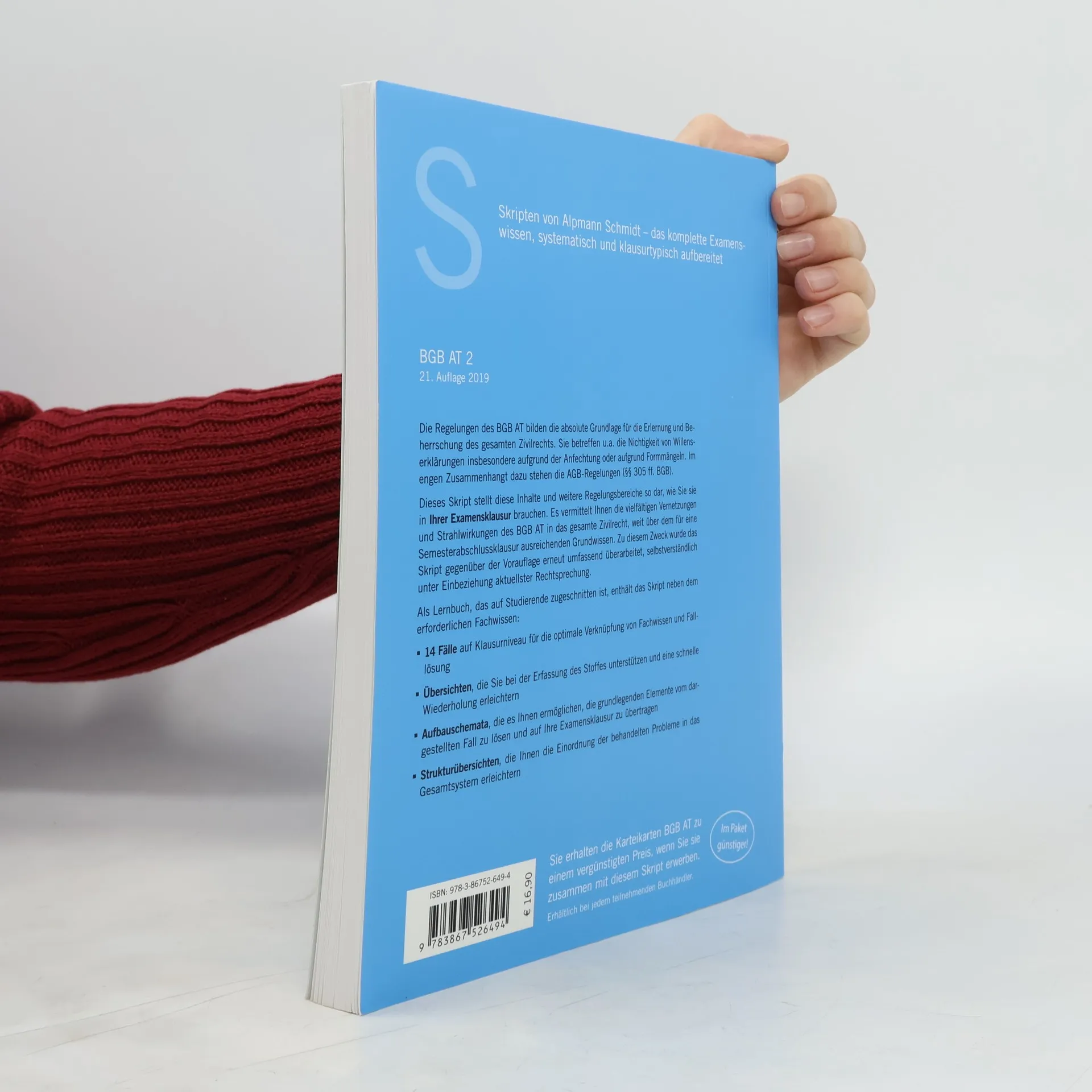 Vorteile - Konzentration auf das Examenswissen - Optimale Verknüpfung von Fachwissen und Falllösung - Übersichtliche Schemata - Struktur- und Klausurhinweise Zur Reihe Alpmann Skripten - Das komplette Examenswissen Zum Werk Das Buch enthält als Fortsetzung zum Skript BGB AT 1 folgende Themen aus dem Allgemeinen Teil des BGB: 1. Teil: Die Nichtigkeit der Willenserklärung und des Vertrags (mangelnde Geschäftsfähigkeit, Nichtigkeit nach §§ 134, 138 BGB, Formbedürftigkeit, Anfechtung, Teilnichtigkeit, Umdeutung und Bestätigung) 2. Teil: Die Allgemeinen Geschäftsbedingungen (AGB) (Anwendungsbereich der §§ 305 ff BGB, Einbeziehung von AGB, Auslegung und Inhaltskontrolle, Rechtsfolgen der Unwirksamkeit einer Vertragsbestimmung) 3. Teil: Fristen, Termine, Verjährung Zielgruppe Studierende