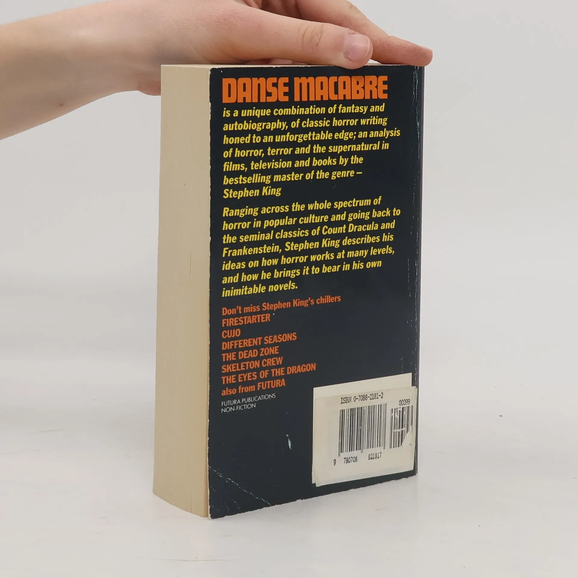 DANSE MACABRE is a unique combination of fantasy and autobiography, of classic horror writing honed to an unforgettable edge; an analysis of horror, terror and the supernatural in films, television and books by the bestselling master of the genre — Stephen King Ranging across the whole spectrum of horror in culture and going back to the seminal classics of Count Dracula and Frankenstein, Stephen King describes his ideas on how horror works at many levels, and how he brings it to in his own inimitable novels. --back cover