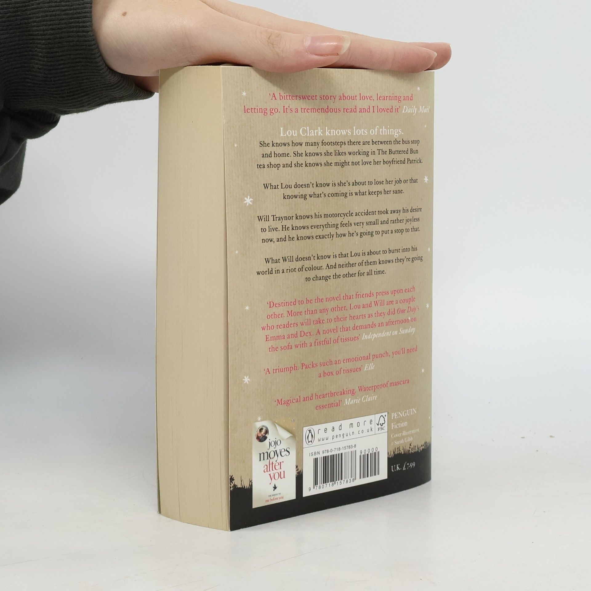 Lou Clark knows lots of things. She knows how many footsteps there are between the bus stop and home. She knows she likes working in The Buttered Bun tea shop and she knows she might not love her boyfriend Patrick. What Lou doesn't know is she's about to lose her job or that knowing what's coming is what keeps her sane. Will Traynor knows his motorcycle accident took away his desire to live. He knows everything feels very small and rather joyless now and he knows exactly how he's going to put a stop to that. What Will doesn't know is that Lou is about to burst into his world in a riot of colour. And neither of them knows they're going to change the other for all time.