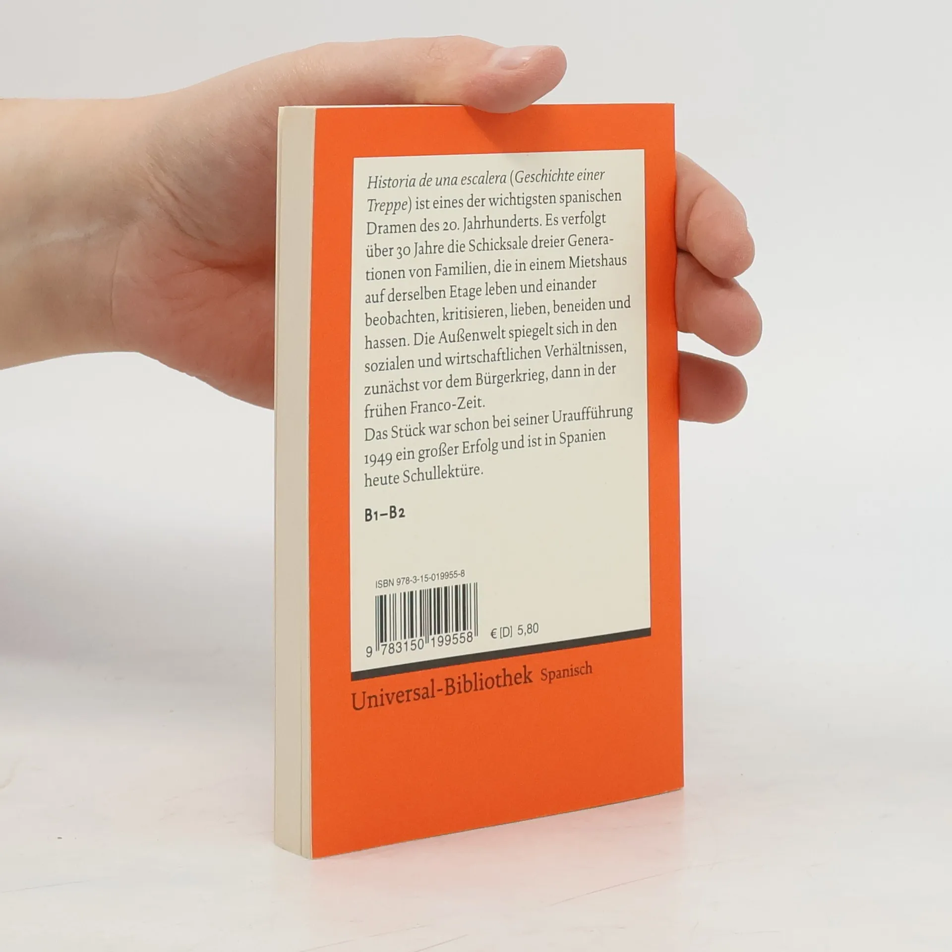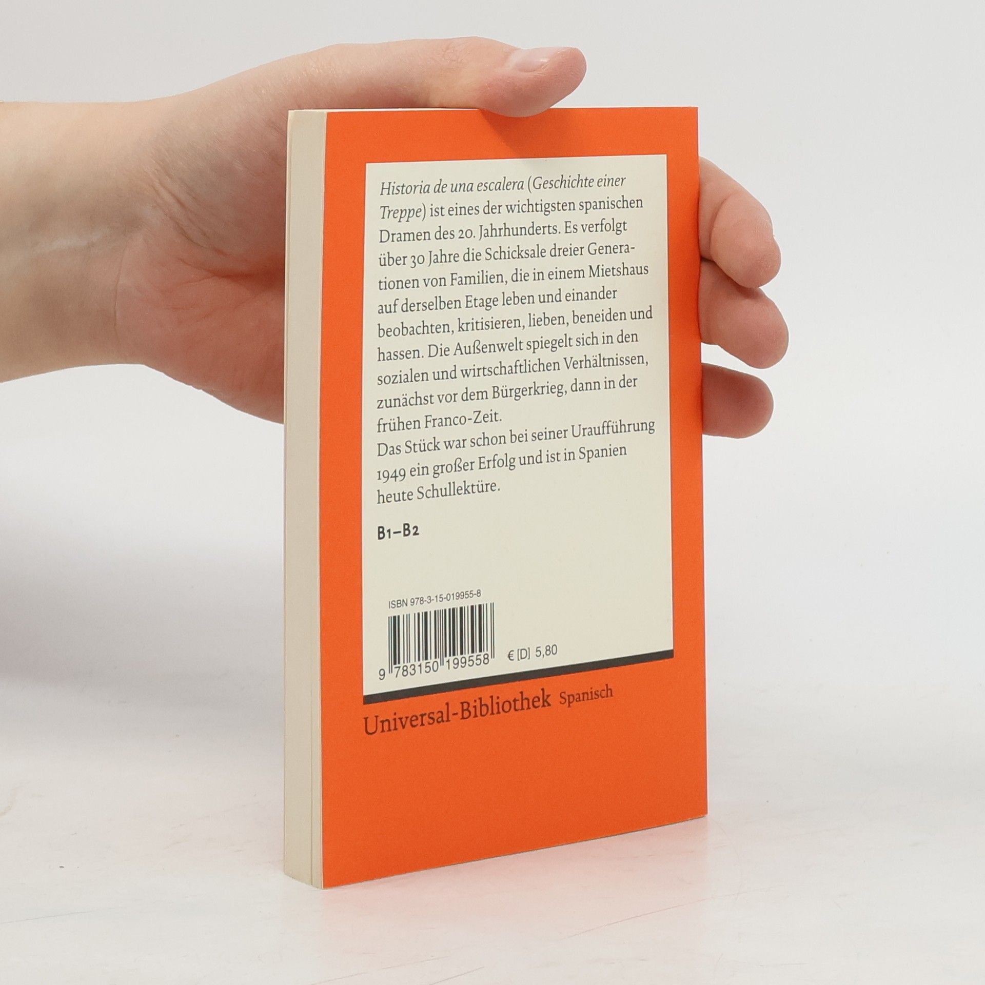 Spanische Literatur in Reclams Roter Reihe: das ist der spanische Originaltext – ungekürzt und unbearbeitet mit Worterklärungen am Fuß jeder Seite, Nachwort und Literaturhinweisen. Die »Geschichte eines Treppenhauses« erstreckt sich über 30 Jahre – von 1919 bis 1949, dem Jahr der Uraufführung – und zeigt die vier Parteien eines Stockwerks, die einander beobachten, kritisieren, lieben, heiraten, beneiden und hassen. Die Außenwelt spiegelt sich in den wirtschaftlichen und sozialen Verhältnissen, damit wird auch die Tristesse der Franco-Zeit thematisiert. Antonio Buero Vallejo (1916–2000) ist einer der bedeutendsten spanischen Dramatiker des 20. Jahrhunderts. Sein mit dem Theaterpreis ›Premio Lope de Vega‹ ausgezeichnetes Stück ist in Spanien Schullektüre. Spanische Lektüre: Niveau B1 – B2 (GER)