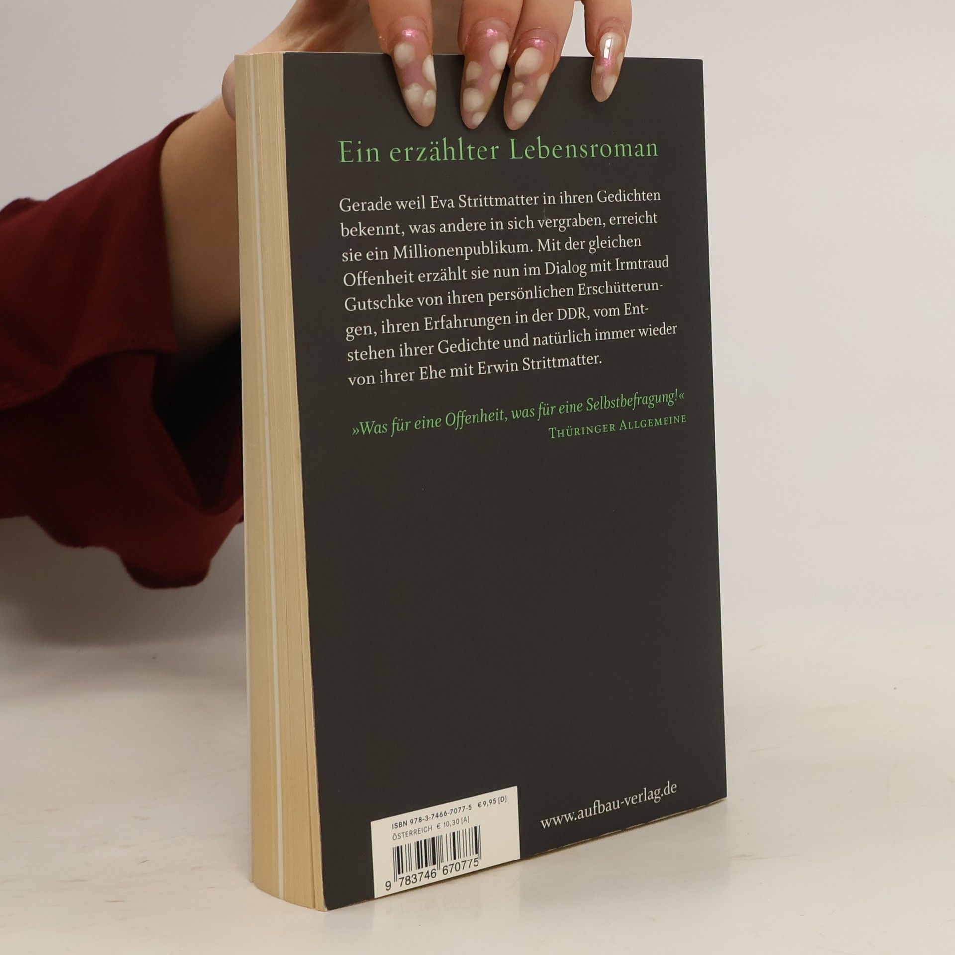 Ein erzählter Lebensroman Gerade weil Eva Strittmatter in ihren Gedichten bekennt, was andere in sich vergraben, erreicht sie ein Millionenpublikum. Mit der gleichen Offenheit erzählt sie nun im Dialog mit Irmtraud Gutschke von ihren persönlichen Erschütterungen, ihren Erfahrungen in der DDR, vom Entstehen ihrer Gedichte und natürlich immer wieder von ihrer Ehe mit Erwin Strittmatter. »Was für eine Offenheit, was für eine Selbstbefragung!« Thüringer Allgemeine