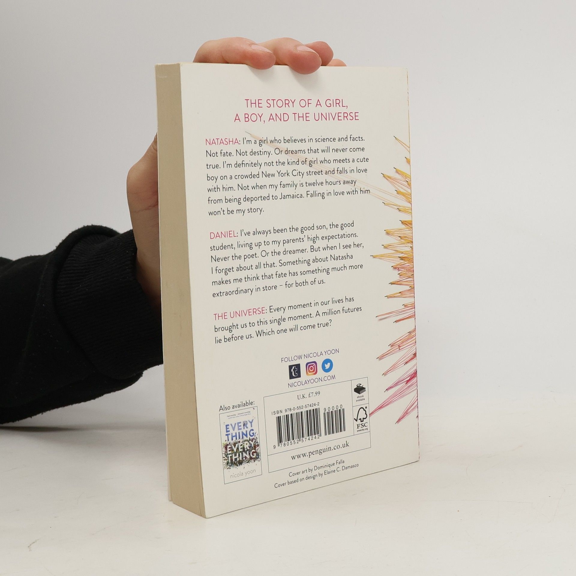 The dazzling new novel from Nicola Yoon, the New York Times bestselling author of Everything, Everything Natasha: I'm a girl who believes in science and facts. Not fate. Not destiny. Or dreams that will never come true. I'm definitely not the kind of girl who meets a cute boy on a crowded New York City street and falls in love with him. Not when my family is twelve hours away from being deported to Jamaica. Falling in love with him won't be my story. Daniel: I've always been the good son, the good student, living up to my parents' high expectations. Never the poet. Or the dreamer. But when I see her, I forget about all that. Something about Natasha makes me think that fate has something much more extraordinary in store-for both of us. The Universe: Every moment in our lives has brought us to this single moment. A million futures lie before us. Which one will come true?
