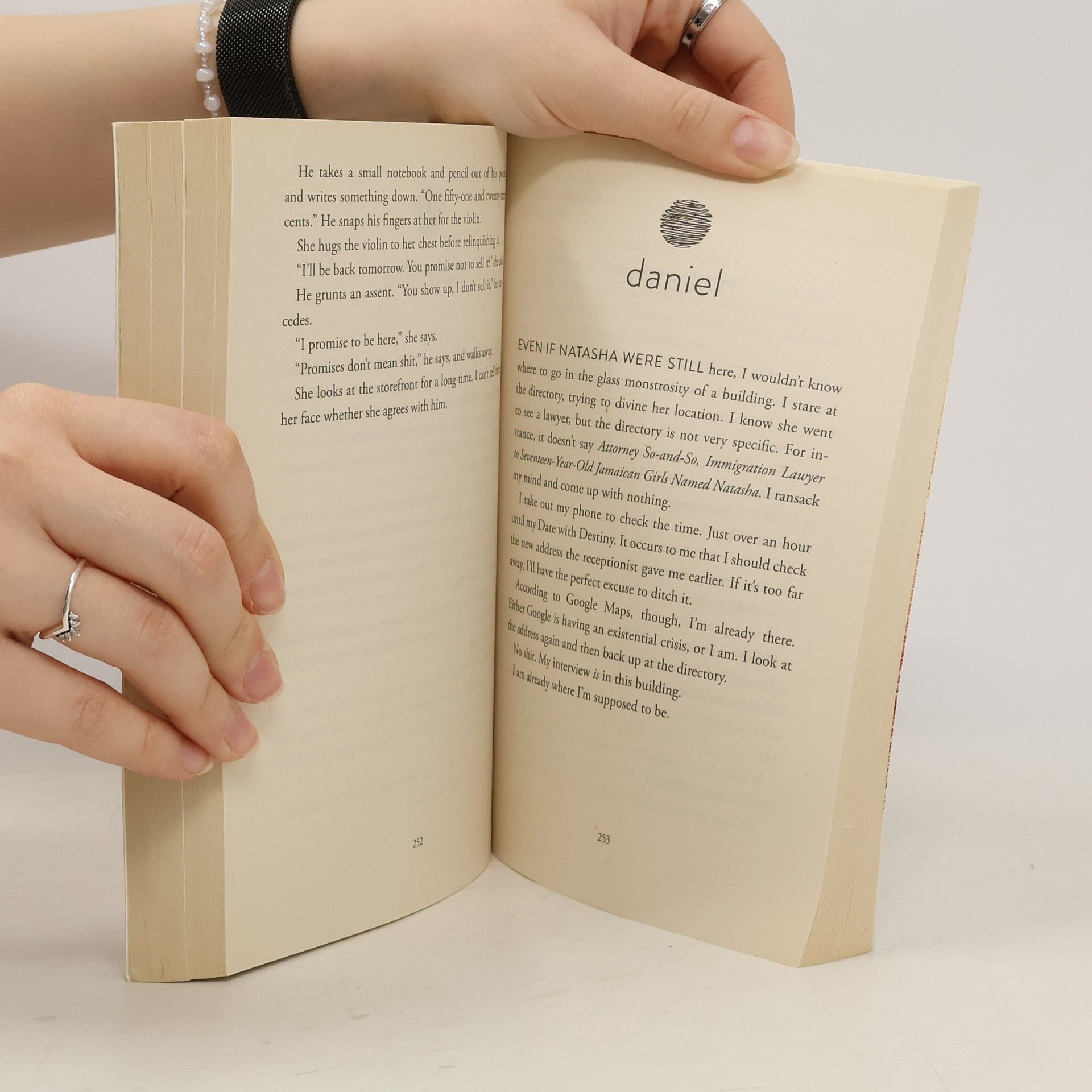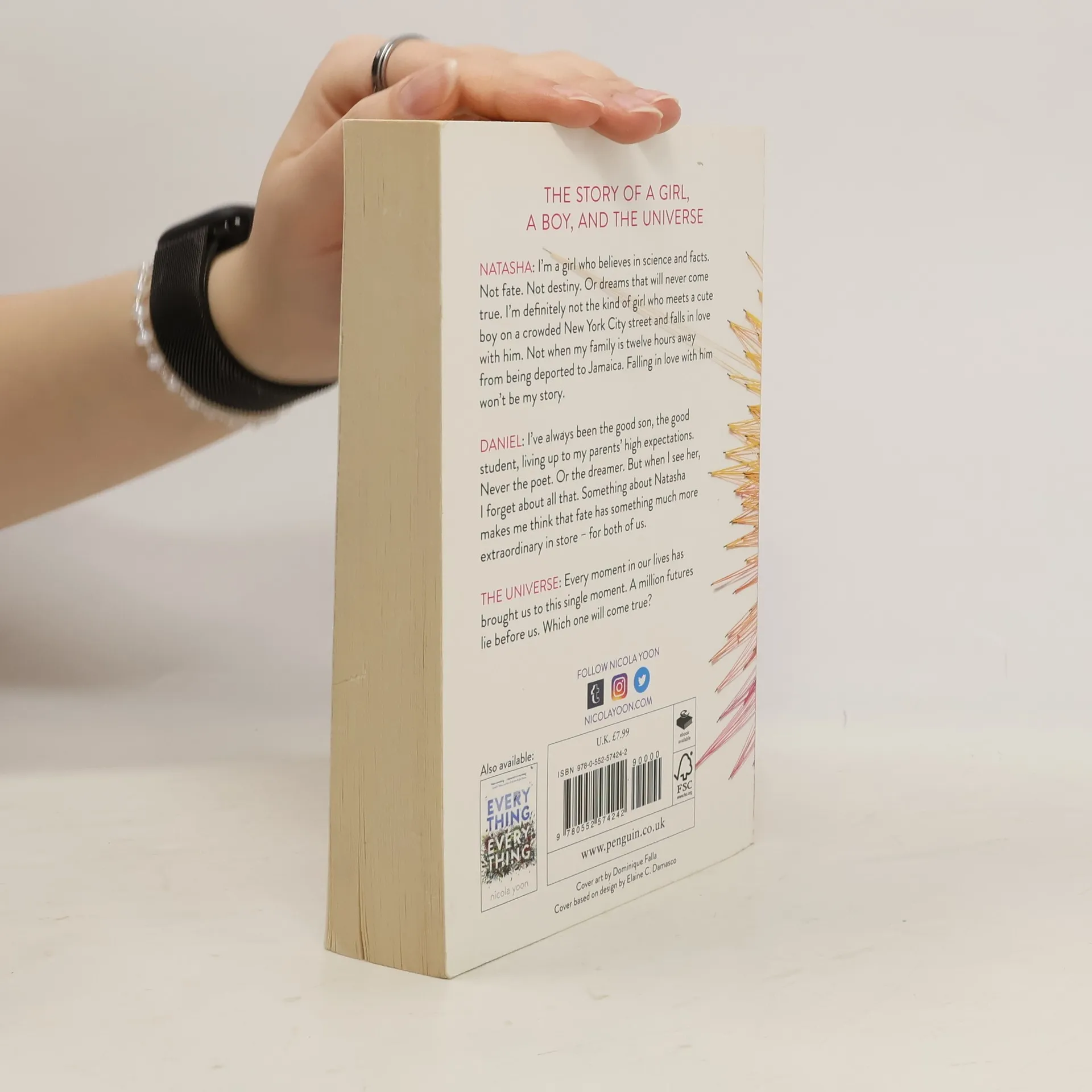 The dazzling new novel from Nicola Yoon, the New York Times bestselling author of Everything, Everything Natasha: I'm a girl who believes in science and facts. Not fate. Not destiny. Or dreams that will never come true. I'm definitely not the kind of girl who meets a cute boy on a crowded New York City street and falls in love with him. Not when my family is twelve hours away from being deported to Jamaica. Falling in love with him won't be my story. Daniel: I've always been the good son, the good student, living up to my parents' high expectations. Never the poet. Or the dreamer. But when I see her, I forget about all that. Something about Natasha makes me think that fate has something much more extraordinary in store-for both of us. The Universe: Every moment in our lives has brought us to this single moment. A million futures lie before us. Which one will come true?