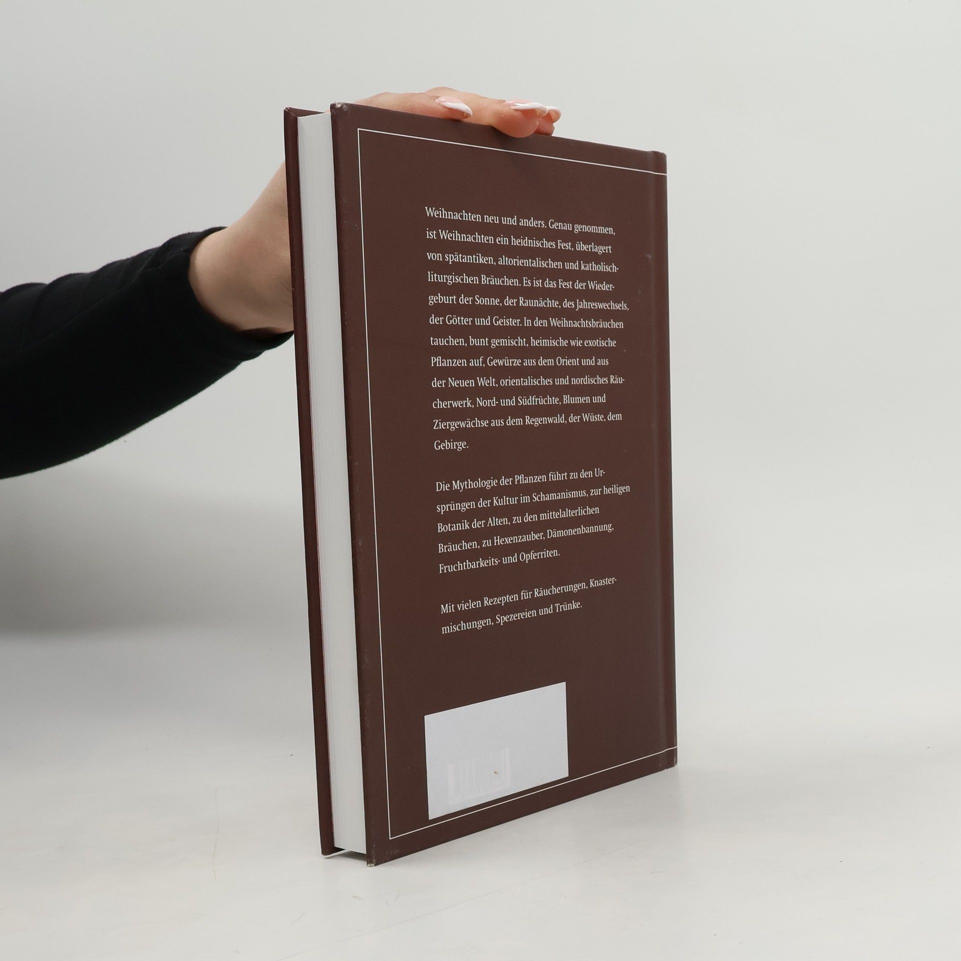 Genau genommen ist Weihnachten ein heidnisches Fest, überlagert von spätantiken, altorientalischen und katholisch-liturgischen Bräuchen. Es ist das Fest der Wiedergeburt der Sonne, der Raunächte, des Jahreswechsels, der Götter und Geister. In den Weihnachtsbräuchen tauchen, bunt gemischt, heimische wie exotische Pflanzen auf, Gewürze aus dem Orient und aus der Neuen Welt, orientalisches und nordisches Räucherwerk, Nord- und Südfrüchte, Blumen und Ziergewächse aus dem Regenwald, der Wüste, dem Gebirge. Die Mythologie der typischen Weihnachtspflanzen führt zu den Ursprüngen der Kultur im Schamanismus, zur heiligen Botanik der Alten, zu den mittelalterlichen Bräuchen, zu Hexenzauber, Dämonenbannung, Fruchtbarkeits- und Opferriten. Mit vielen Rezepten für Räucherungen, Knastermischungen, Spezereien und Trünke.