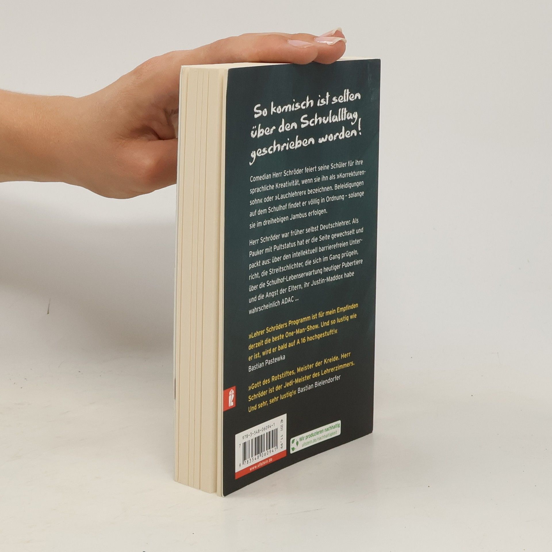So komisch ist selten über den Schulalltag geschrieben worden! Comedian Herr Schröder feiert seine Schüler für ihre sprachliche Kreativität, wenn sie ihn als „Korrekturensohn“ oder „Lauchlehrer“ bezeichnen. Beleidigungen auf dem Schulhof findet er völlig in Ordnung – solange sie im dreihebigen Jambus erfolgen. Herr Schröder war früher selbst Deutschlehrer. Als Pauker mit Pultstatus hat er die Seite gewechselt und packt aus: über den intellektuell barrierefreien Unterricht, die Streitschlichter, die sich im Gang prügeln, über die Schulhof-Lebenserwartung heutiger Pubertiere und die Angst der Eltern, ihr Justin-Maddox habe wahrscheinlich ADAC …