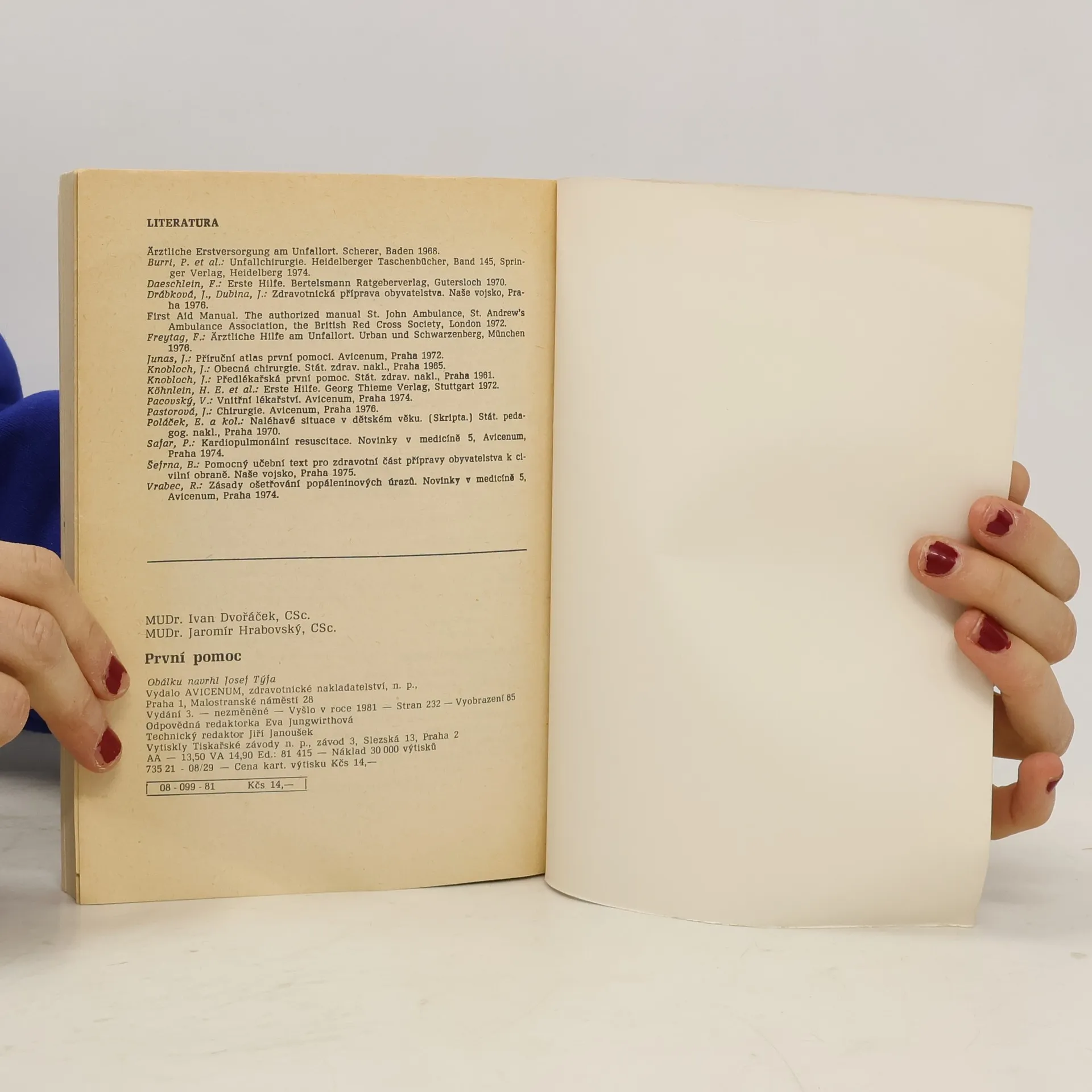 Učebnice pro zdravotnické školy. Příručka seznamuje s nejdůležitějšími postupy při poskytování první pomoci, zejména při stavech bezprostředního ohrožení života. Po výkladu o struktuře a základních funkcích organismu informuje o provádění neodkladnéresuscitace, o první pomoci v případě bezvědomí, šoku, krvácení, závažných i menších poranění, akutních otravách apod