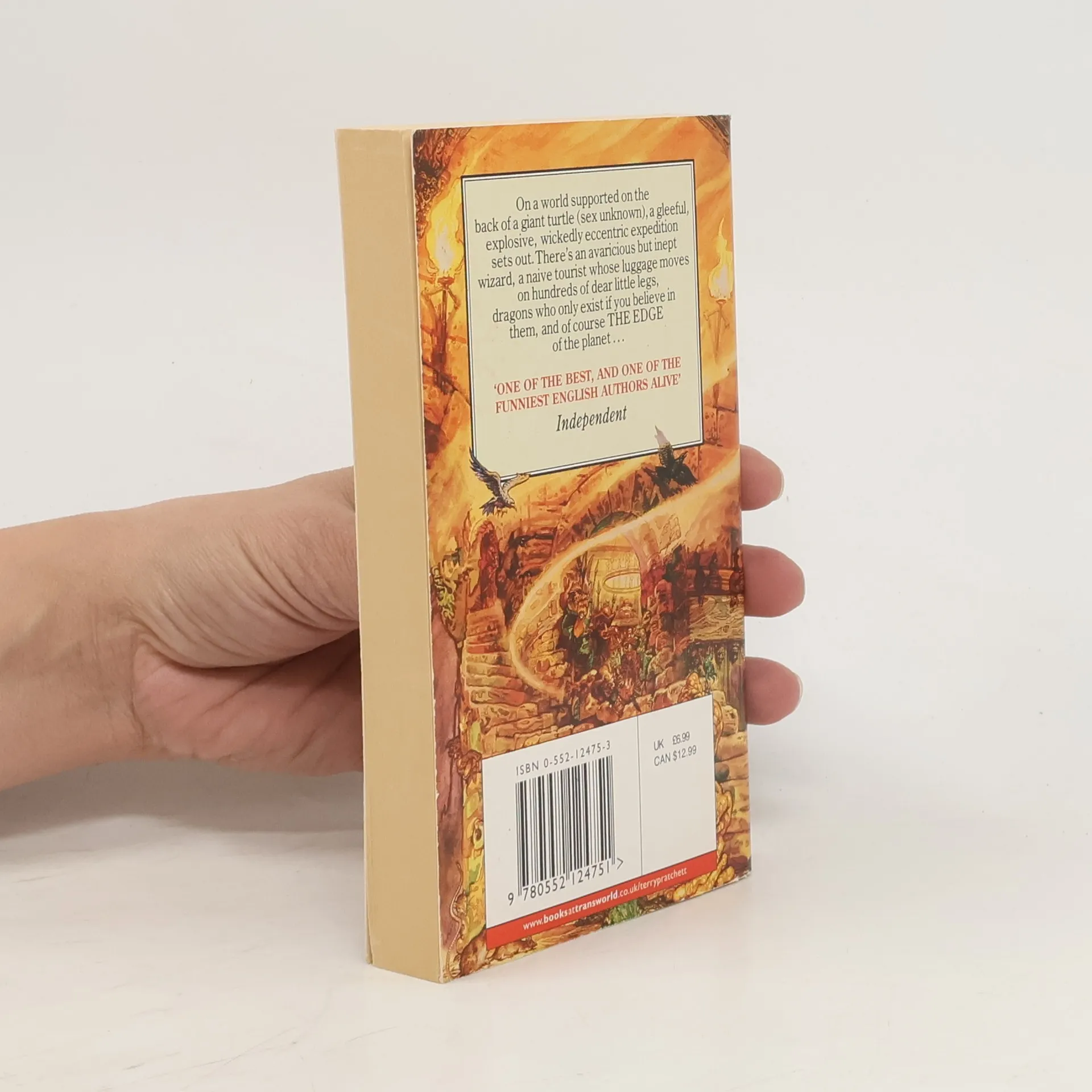 On a world supported on the back of a giant turtle (sex unknown), a gleeful, explosive, wickedly eccentric expedition sets out. There's an avaricious buy inept wizard, a naïve tourist whose luggage moves on hundreds of dear little legs, dragons who only exist ifyou believe in them, and of course THE EDGE of the planet...