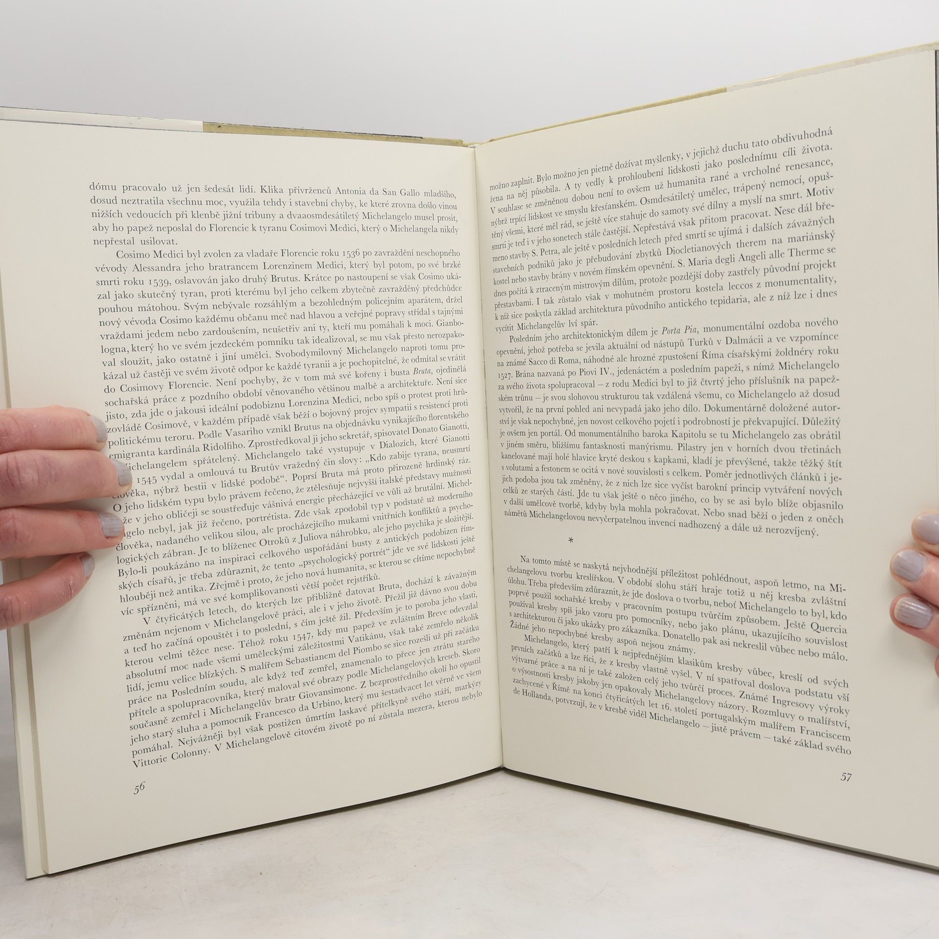 Kniha obsahuje textovou část, kde autor, známý odborný výtvarný kritik, hodnotí a sděluje podstatné informace ze života geniálního malíře, sochaře, ale i architekta a básníka. Bohužel reprodukce jsou černobílé, i když u sochařských děl to není tak podstatné. K plnému porozumění kvality díla potřebuje zvídavý člověk slovo odborníka. I když dílo Michelangela dokáže oslovit snad každého. Kniha formátu A 3.