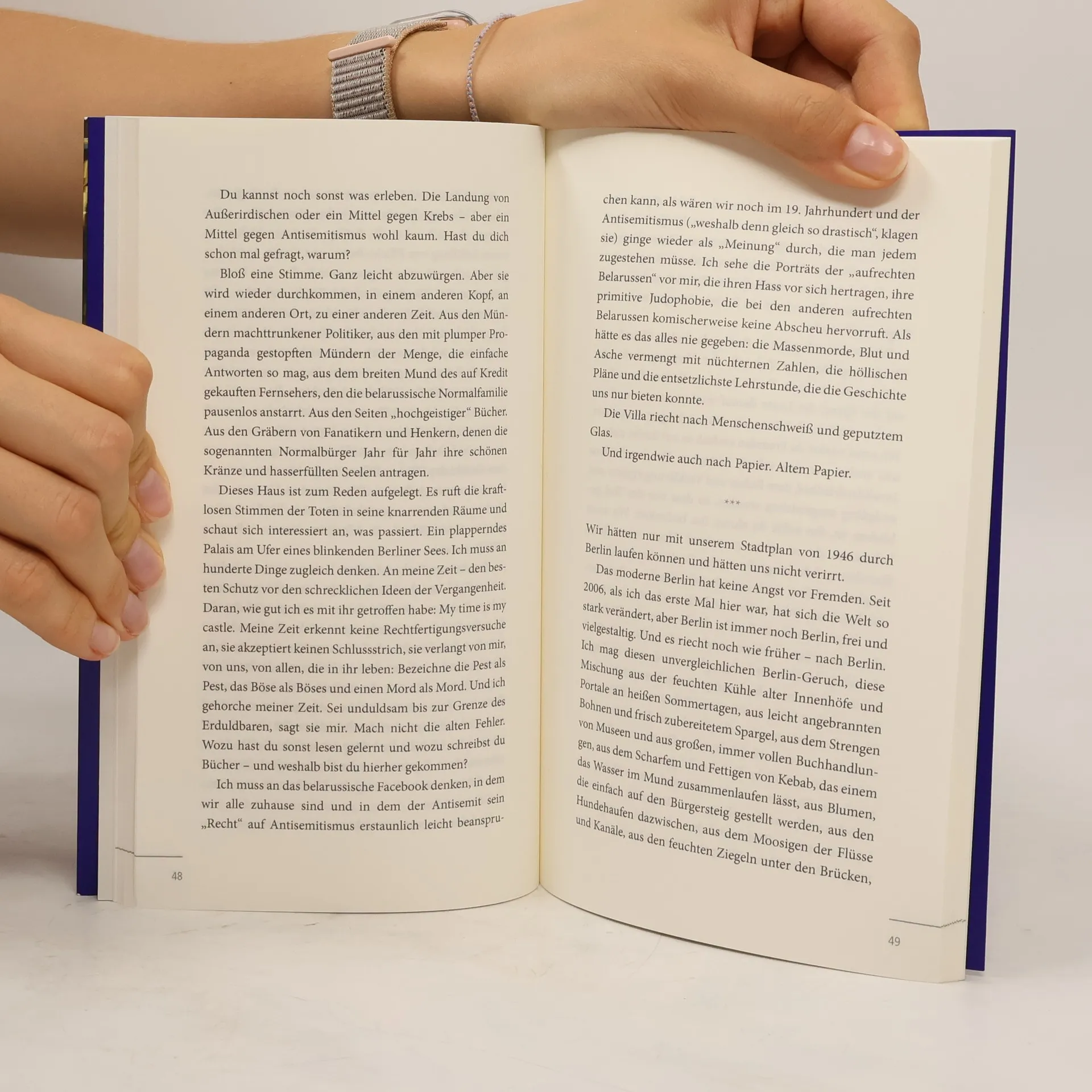 „Wenn ein Belarusse behauptet, er wäre ein Stadtmensch durch und durch, ist Skepsis angebracht. Soll er erst einmal seine Ausweispapiere vorzeigen … Schon fliegt der Schwindel auf …“ Der Städter Bacharevič schreibt in drei Essays über Berlin und Paris und nebenbei über seine Stadt Minsk und die Literatur und, ja, natürlich: über das Dorf. Ein europäischer Blick auf drei Städte Europas, die der Autor mit großer Leichtigkeit, Lebendingkeit und Überzeugungskraft miteinander verbindet: europäische GeschichteN as its best.