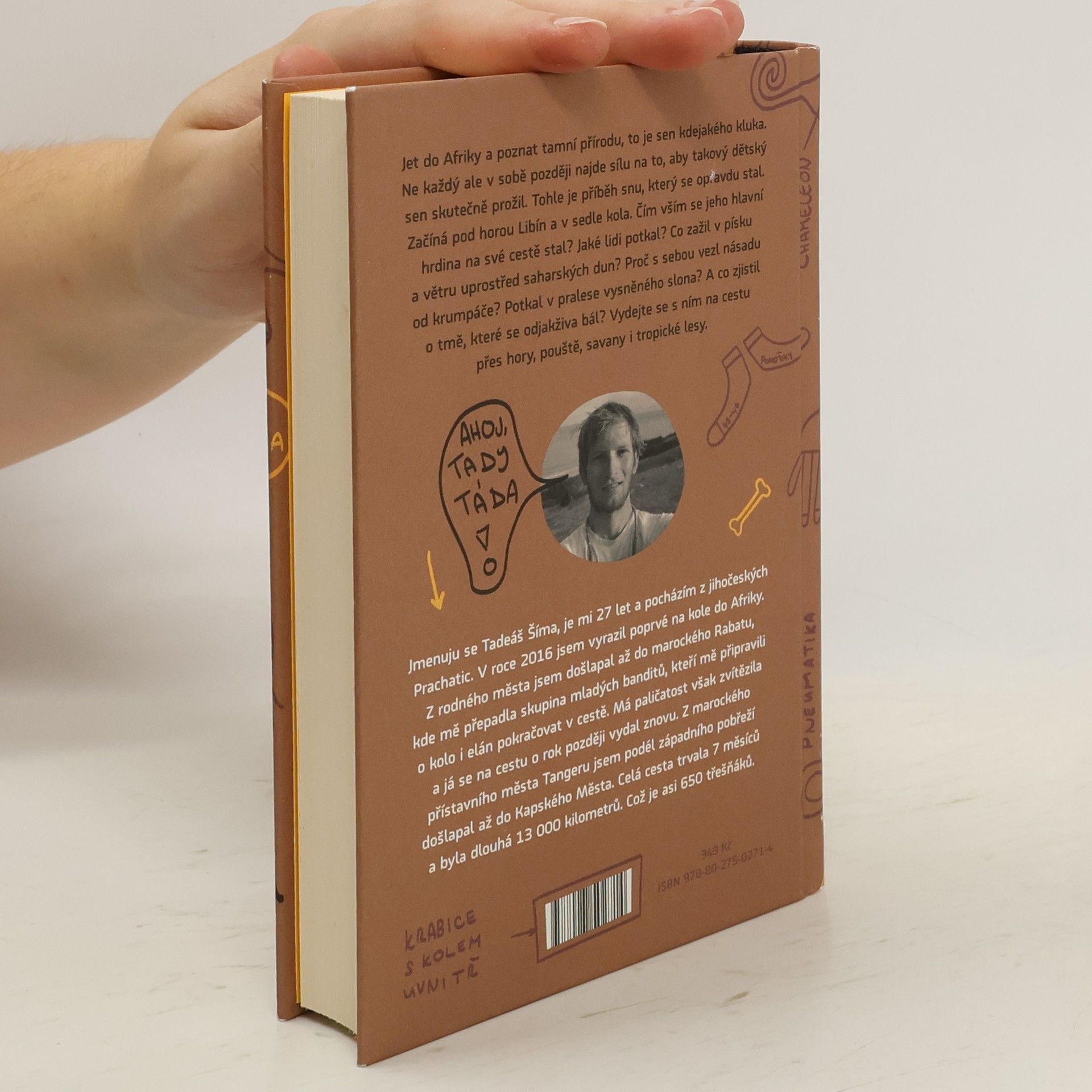 Jet do Afriky a poznat tamní přírodu, to je sen kdejakého kluka. Ne každý ale v sobě později najde sílu na to, aby takový dětský sen skutečně prožil. Tohle je příběh snu, který se opravdu stal. Začíná pod horou Libín a v sedle kola. Čím vším se jeho hlavní hrdina na své cestě stal? Jaké lidi potkal? Co zažil v písku a větru uprostřed saharských dun? Proč s sebou vezl násadu od krumpáče? Potkal v pralese vysněného slona? A co zjistil o tmě, které se odjakživa bál? Vydejte se s ním na cestu přes hory, pouště, savany i tropické lesy. Jmenuji se Tadeáš Šíma, je mi 27 let a pocházím z jihočeských Prachatic. V roce 2016 jsem vyrazil poprvé do Afriky na kole. Z rodného města jsem došlapal až do marockého Rabatu, kde mě přepadla skupina mladých banditů, kteří mě připravili o kolo i elán pokračovat cestě. Má paličatost však zvítězila a já se o rok později na cestu vydal znovu. Z marockého přístavního města Tanger jsem podél západního pobřeží došlapal až do Kapského Města. Celá cesta trvala 7 měsíců a byla dlouhá 13 000 kilometrů. Což je asi 650 Třešňáků. 1 Třešňák = 20 km