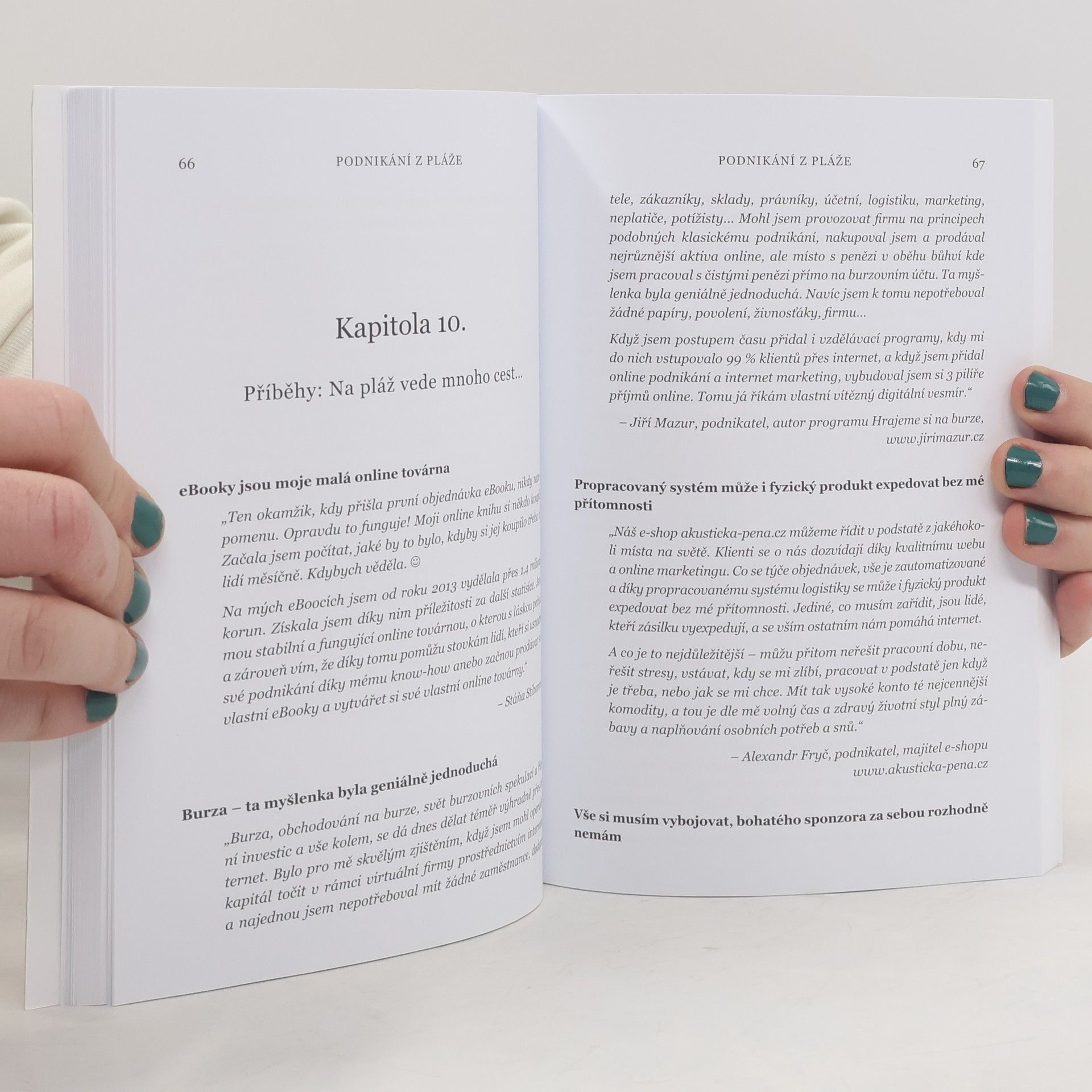 Slovy autorky: "Máte chuť žít život, ze kterého si nemusíte brát dovolenou? Život, ve kterém se ohlédnete a vydechnete úžasem, že toto všechno jste zažili? Život, ve kterém máte svobodu žít svobodně, radostně a naplno? O tom všem je kniha podnikání z pláže... Vítejte v mém světě :) Mou velkou touhou je inspirovat Vás v této knize k tomu, abyste žili také svůj příběh. Ten příběh, který chcete o sobě vyprávět. Chci Vám ukázat, že si můžete plnit sny, jakkoli bláznivé se můžou zdát, a že všechna omezení stojí jen ve Vaší mysli jako zdi, za kterými se ty sny skrývají. Přeji si, aby tato kniha některé z těchto zdí, na kterých je napsáno "Toto nejde!", zbourala, otevřela nové obzory a vrátila Vám křídla ke svobodě, o kterých jste možná už zapomněli, že je máte. Věřím, že Vám kniha ukáže, že podnikání z pláže je styl života, který je dnes díky internetu dostupný pro každého. Knihou se prolínají navíc příběhy podnikatelů a lidí, kteří už žijí život svobodně, radostně a naplno. Jsou to příběhy, které úžasně doplňují tu praktickou část podnikání z pláže a dávají inspiraci i naději, že žít život svých snů dokáže každý, kdo se rozhodne :) "