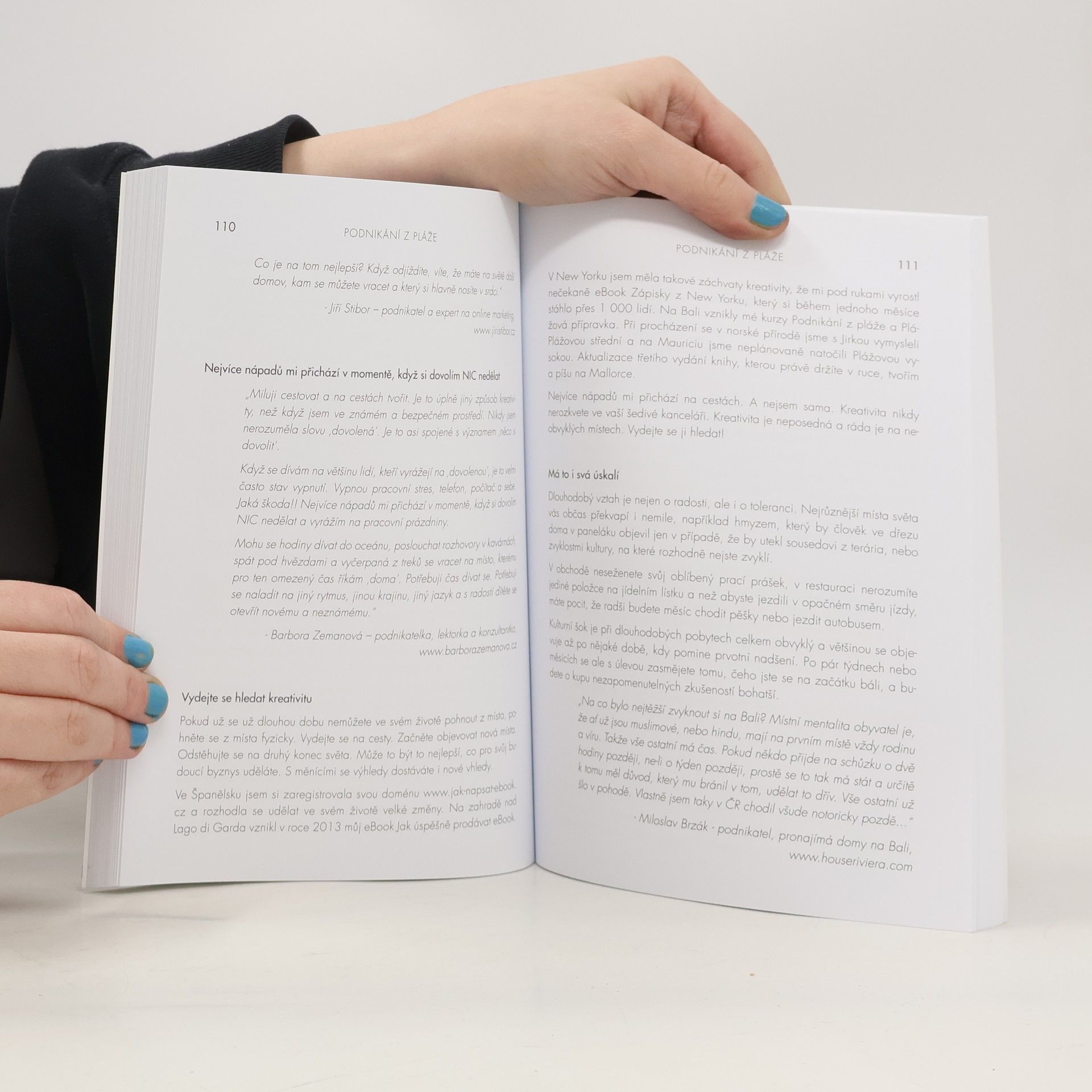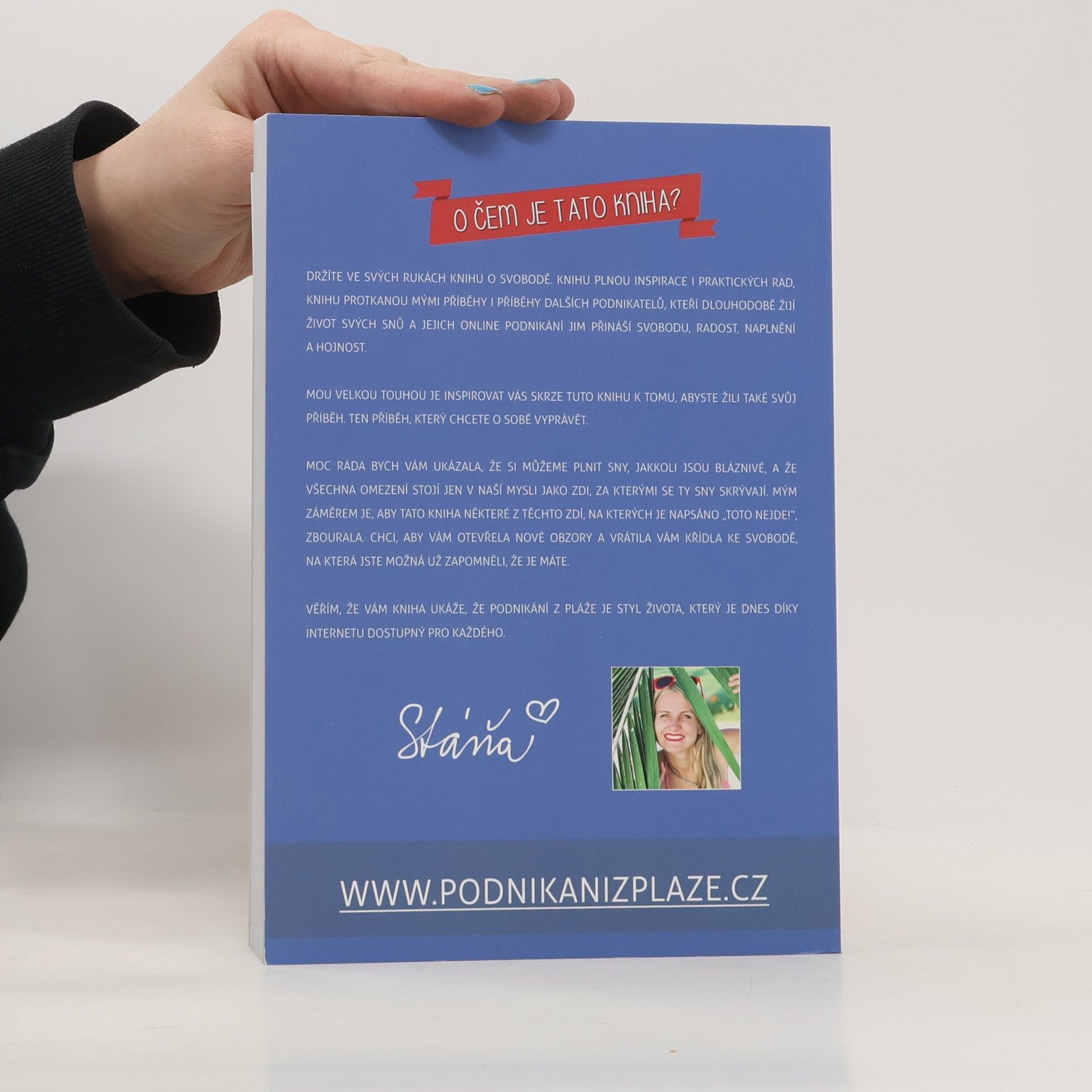 Nové, aktualizované a rozšířené vydání z roku 2020. Autorka o své knize píše: Je to pár let, co jsem žila na okraji zaprášeného sídliště v Havířově. V srdci jsem měla veliké sny o tom, jak procestuji svět, navštívím Himaláje, prožiju zimy na Bali a ukážu svým dětem krásy života. Realita byla ale dost jiná. Dvě maličké děti, krachující stavební firma i manželství a v peněžence pár korun. Bylo mi 26 let a měla jsem pocit, že jsem odsouzena k životu, který absolutně nemá smysl. Jaký má totiž smysl život, ve kterém není místo pro lásku, svobodu a splněné sny? Jaký smysl má žít život, ve kterém má člověk pořád strach, jak vyjde s penězi další měsíc? Jaký smysl má ukazovat dětem život, ve kterém já nejsem šťastná? Budou jednou šťastné ony? Rozhodla jsem se to změnit. O náročné proměně mého života, mých krocích do neznáma, vypořádávání se se strachem, stejně jako o tom, jak jsem díky tomu došla až ke životu, který žiju dnes, je právě moje kniha Podnikání z pláže.