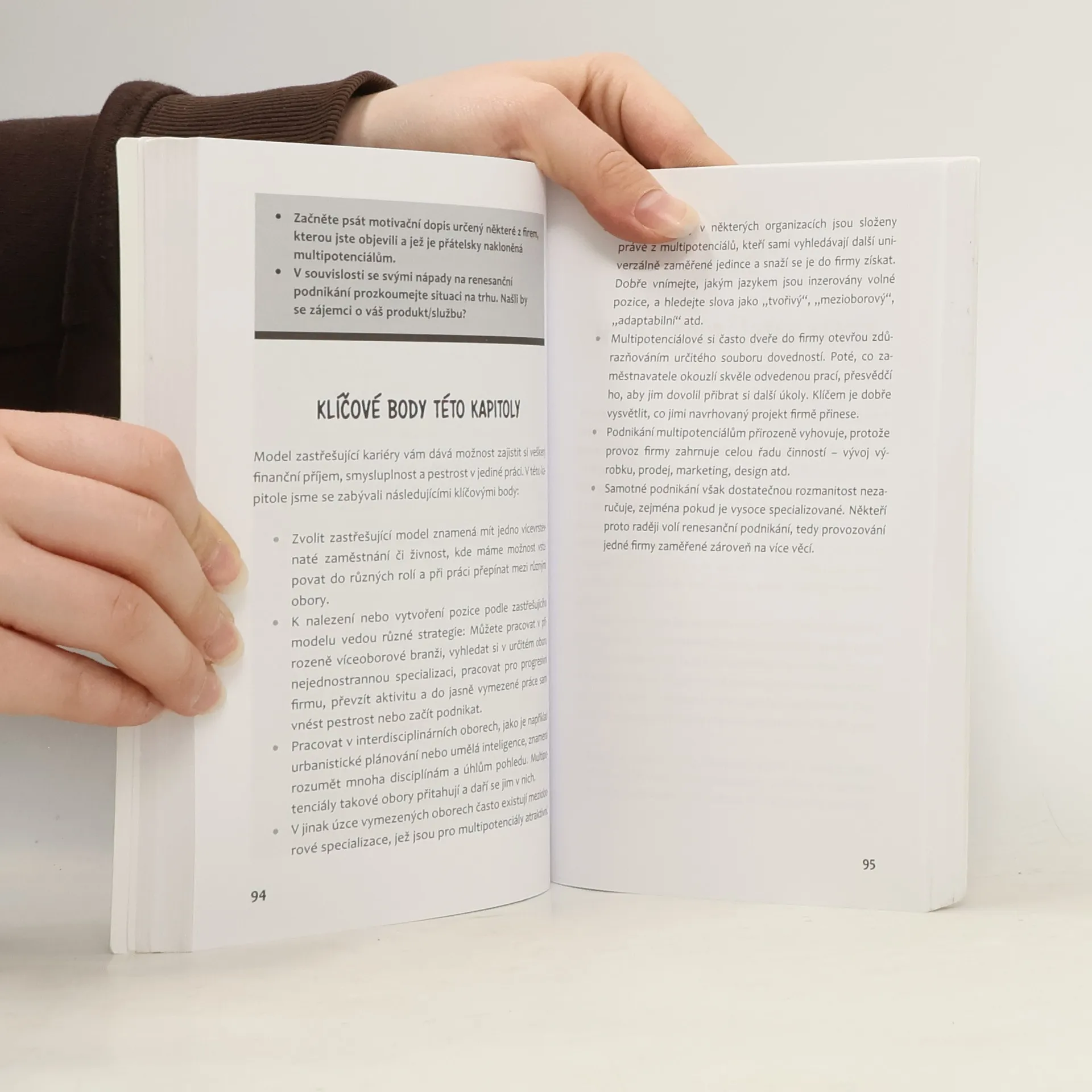 Otázka „Čím chceš být, až vyrosteš?“ vyvolává dojem, jako by si každý z nás musel vybrat jeden druh zaměstnání a jednu vášeň, jíž se v životě bude věnovat. Jenže jsou i lidé, kteří prostě mají řadu zájmů a věnují se – ať už postupně, nebo zároveň – řadě různých projektů. Pro tenhle typ lidí už vzniklo mnoho názvů: třeba renesanční lidé, všeumělové, skeneři nebo – jak je označuje autorka této knihy, která mezi ně počítá i sebe samu – multipotenciálové. Ve své knize píše, v čem je v dnešním světě plném změn multipotencialita výhodou (takoví lidé totiž dovedou syntetizovat ideje, rychle se učí, jsou adaptabilní a myslí v souvislostech). Radí, pomocí jakých strategií se dá zaměřit na více projektů. Jak se vypořádat s pocity, jako je strach, že člověk nebude nejlepší, či vina, protože o něco ztratil zájem. Informačně nabitá, chytře psaná a zábavná kniha je vybavena různými výčty, tipy, cvičeními i seznamem slavných multipotenciálů a příkladů interdisciplinárních oborů. Emilie Wapnick se dosud profesionálně nebo akademicky věnovala hudbě, umění, filmu a právu. Je spisovatelkou, výtvarnicí, kariérovou koučkou a zakladatelkou Puttylike.com, kde pomáhá multipotenciálům integrovat jejich zájmy a vést plodný život. Její přednáška z cyklu TED má zatím přes čtyři miliony zhlédnutí.