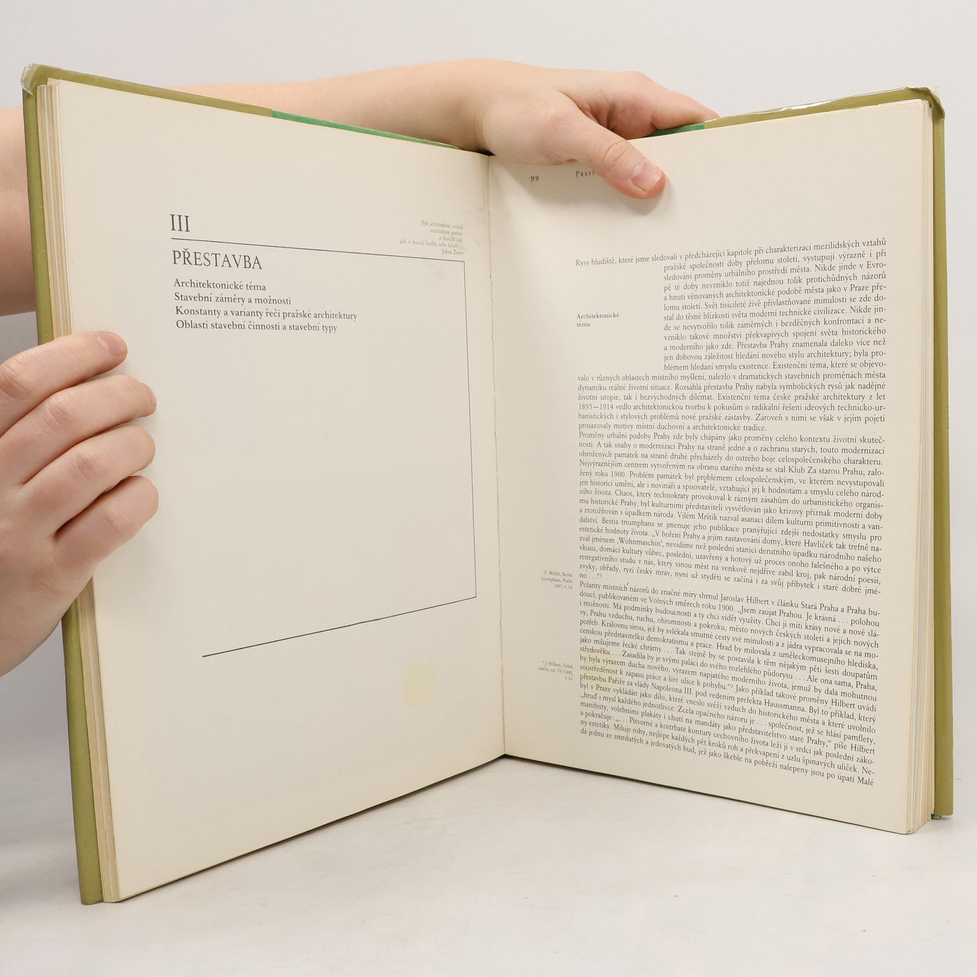 Rozsáhlá monografie věnovaná vývoji kultury Prahy v letech 1890-1914, řeší otázky vztahů architektury, výtvarného umění a literatury, zahrnuje historismus, secesi, symbolismus, průmyslové výstavy, dobové plakáty, noviny, dokonce sportovní utkání, soustřeďuje pozornost na nové souvislosti utváření moderní kultury a uvádí řadu nepublikovaných a zapomenutých obrazů a textů. Vhodné pro čtenáře Pragensie a specialisty na umění, kulturu a historii.