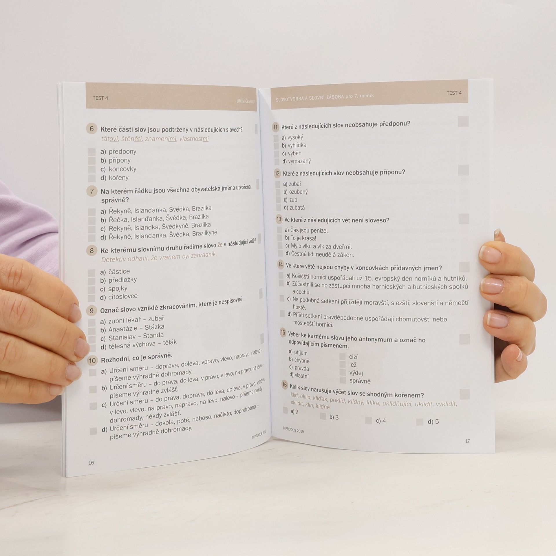 Potřebujete si procvičit češtinu? Přijímací zkoušky jsou možná daleko, ale čas se krátí. Vyzkoušejte nejen testy ze slovotvorby a slovní zásoby, ale také další díly řady Umím češtinu? Co najdete ve Slovotvorbě a slovní zásobě 7? * 10 didaktických testů, každý s 20 různorodými úlohami z českého jazyka * otázky zaměřené na stavbu slova, tvoření a přejímání slov, rozlišování slovních druhů, synonyma, homonyma, antonyma, nadřazenost, podřazenost a příbuznost slov, slova citově zabarvená a na další jazykové jevy * 6 diktátů * přehledně zpracované výsledky * zábavnou doplňovačku na závěr Vyzkoušejte si testové úlohy Umím češtinu? – Slovotvorba a slovní zásoba i online na počítači nebo v mobilním telefonu na umimcestinu.cz. Pusťte se kdykoliv do práce a (nepro) TESTUJTE!