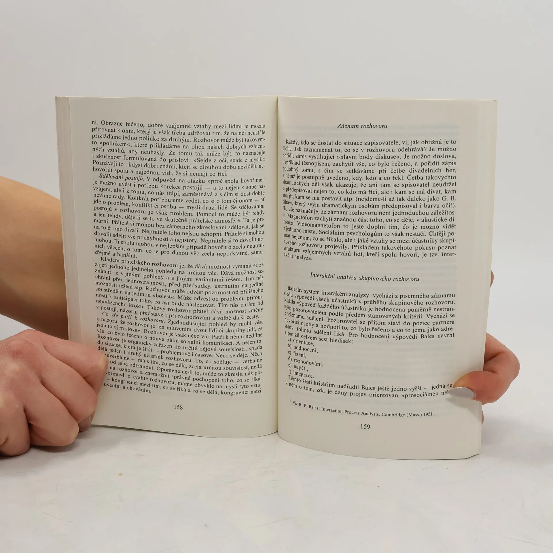 Tato publikace pojednává o tom, co se děje v situacích, kdy se jeden člověk setkává s druhým — když se setkají poprvé i když se setkávají častěji. Jejím předmětem je sociální styk člověka s člověkem a zvláště pak jeho komunikační stránka, tj. to, jak si spolu navzájem slovně i beze slov sdělujeme mnohé — informace, postoje, emoce, svá sebepojetí atp. Důraz je zde položen na mimoslovní způsoby sdělování, tj. na to, co si »říkáme« pohledy, výrazem obličeje, přiblížením či odstupem, pohledy, gesty i »tónem« hlasu. Umění naslouchat je při tom záměrně věnováno podstatně více pozornosti než umění mluvit. Mluvit se učíme odmalička. Kdy a kde se však učíme »vyčíst« z pohledu to, co ten, s nímž jsme se setkali, nám chce vlastně říci, co se v něm děje?
