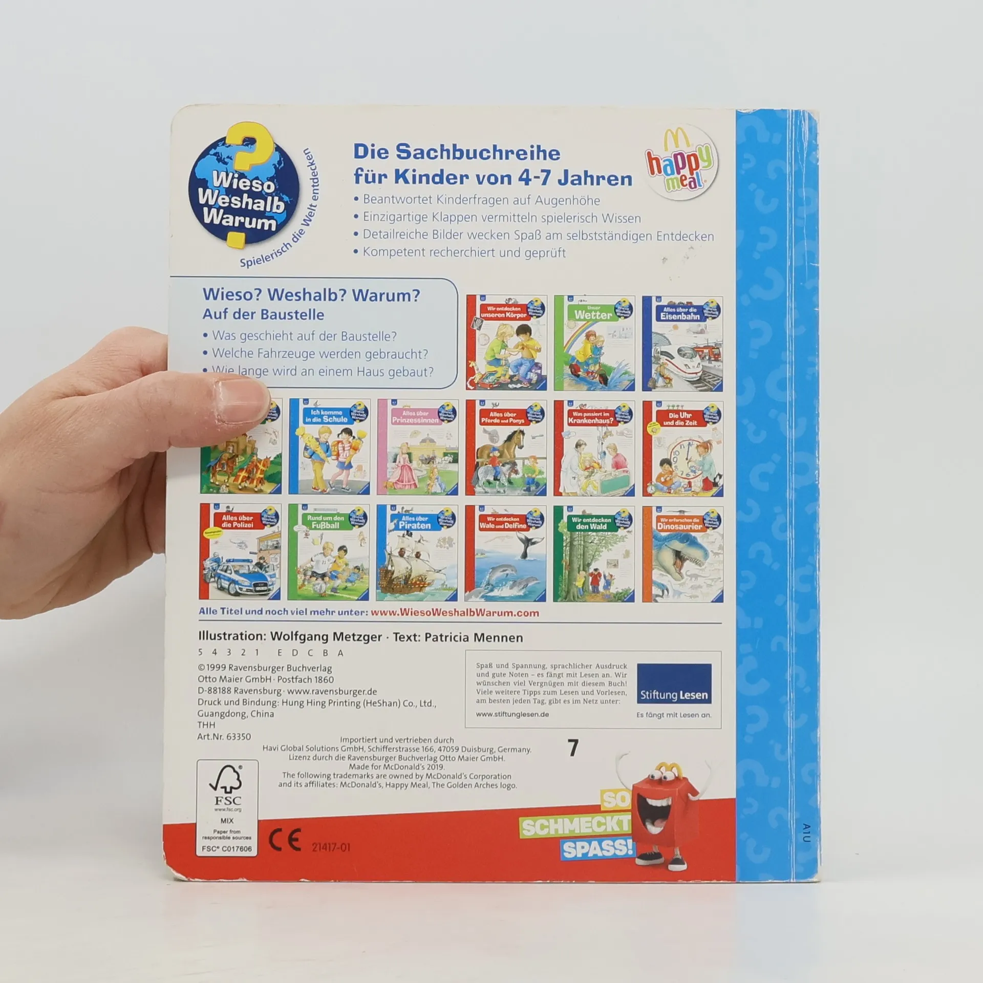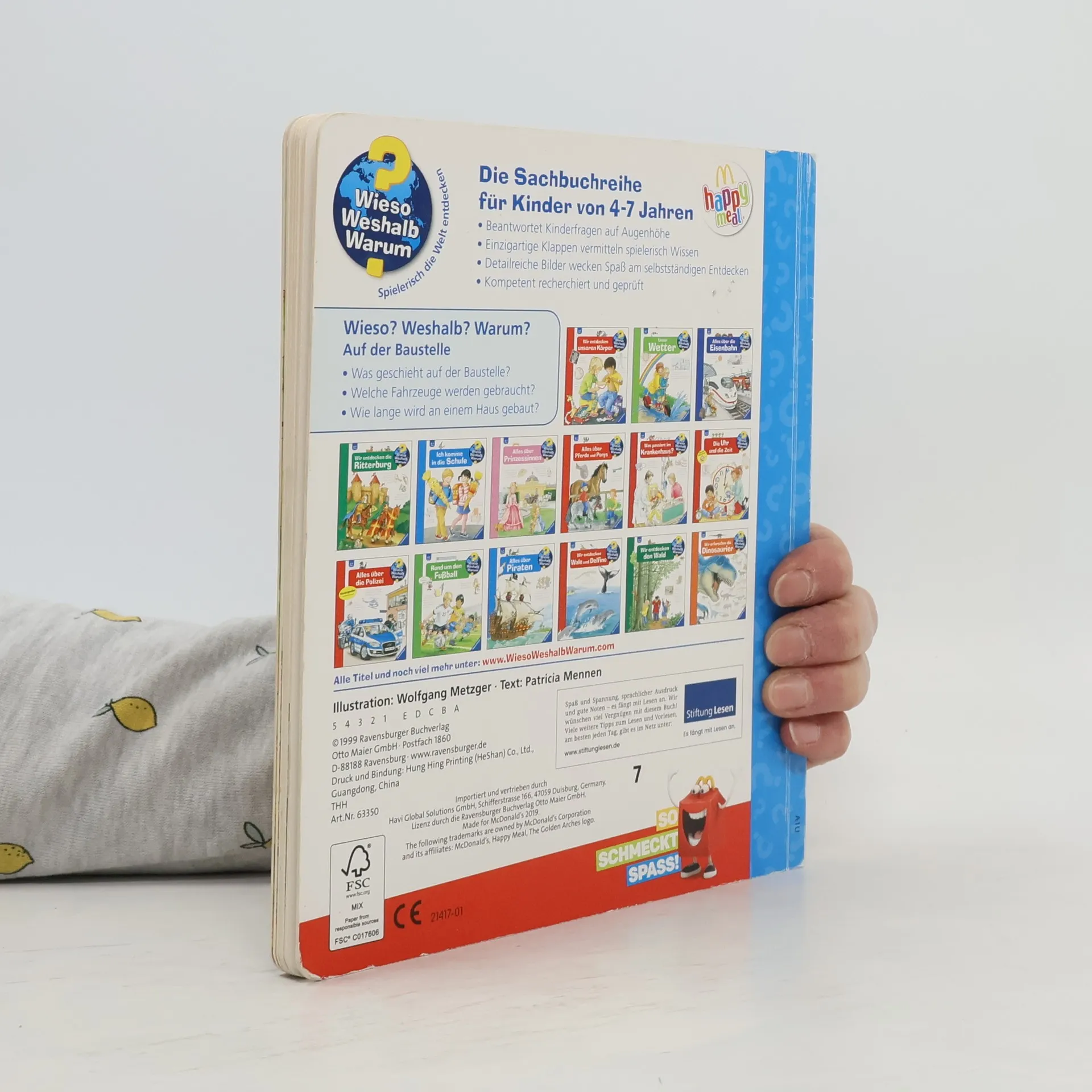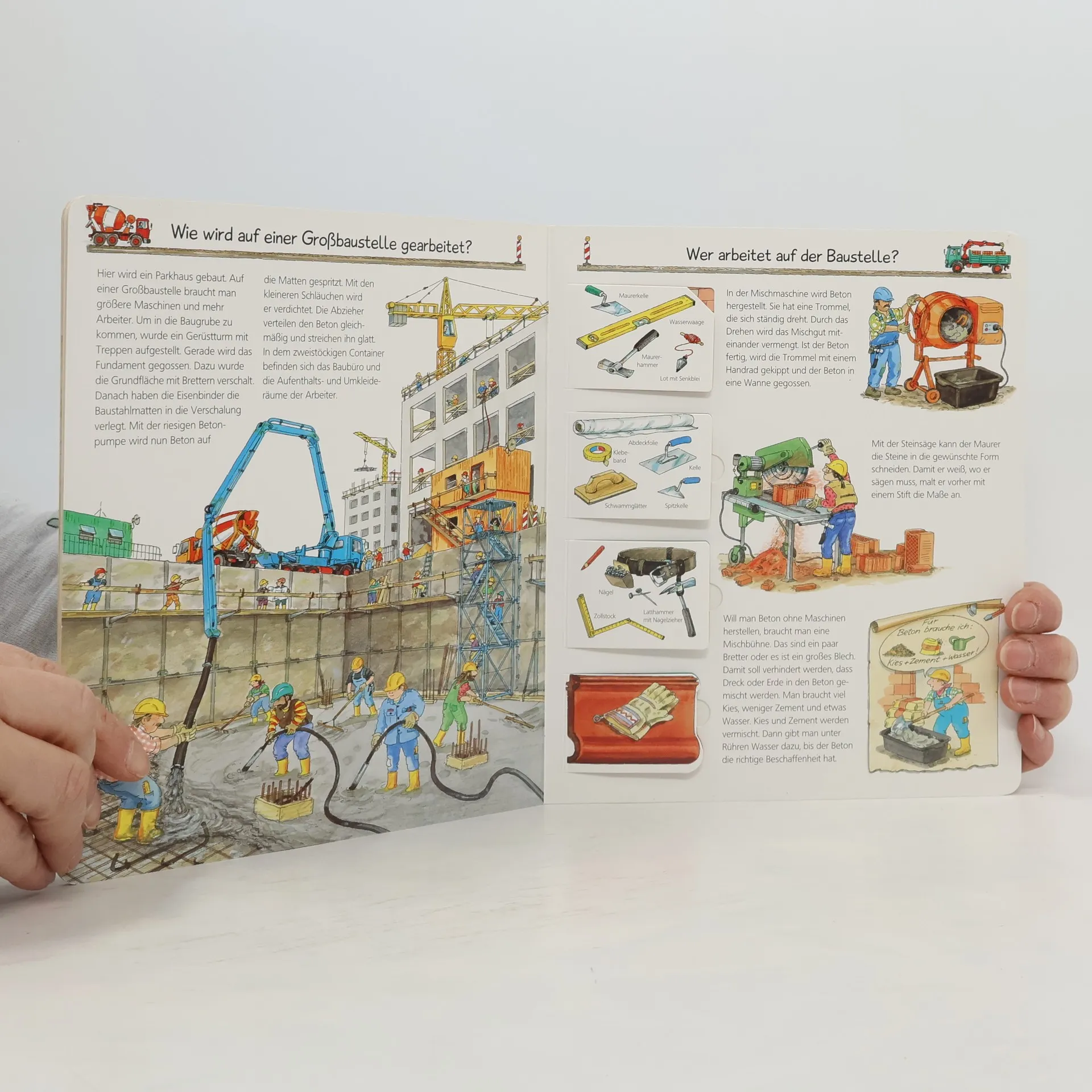 Mitten im Neubaugebiet bestaunen Kinder, wie Schritt für Schritt ein Haus entsteht: von der Vermessung über die Erdarbeiten und den Rohbau bis zum Innenausbau. Dabei entdecken sie Werkzeuge, Baumaschinen und Fahrzeuge. Klappen vermitteln, was Maurer, Zimmerleute und Elektriker für ihre Arbeit brauchen. Wie renoviert man ein altes Haus? Was passiert, wenn es abgerissen werden muss? Und wie werden Straßen und Brücken gebaut? Antworten finden Technik- und Fahrzeugfans in diesem Buch. Wieso? Weshalb? Warum? Die Sachbuchreihe für Kinder von 4–7 Jahren Jeden Tag entdecken Kinder etwas Neues – da kommen viele Fragen auf. Warum sind die Dinosaurier ausgestorben? Wo ist die Sonne in der Nacht? Wozu brauchen wir das Blut? Die beliebte Sachbuchreihe Wieso? Weshalb? Warum? gibt Kindern Antworten auf Augenhöhe. Dabei werden die unterschiedlichsten Themen aus der Alltags- und Interessenswelt der Kinder altersgerecht und mit viel Liebe zum Detail unter die Lupe genommen. Detailreiche Bilder, verständliche Sachtexte und überraschende Klappen, die Bewegungen oder Abläufe veranschaulichen und hinter die Dinge blicken lassen, ermöglichen Kindern, sich ihre Themen selbst zu erschließen. Der Spaß am eigenhändigen Entdecken, die liebevolle Umsetzung und die qualitativ hochwertige Ausstattung garantieren langanhaltende Freude an jedem einzelnen Buch.