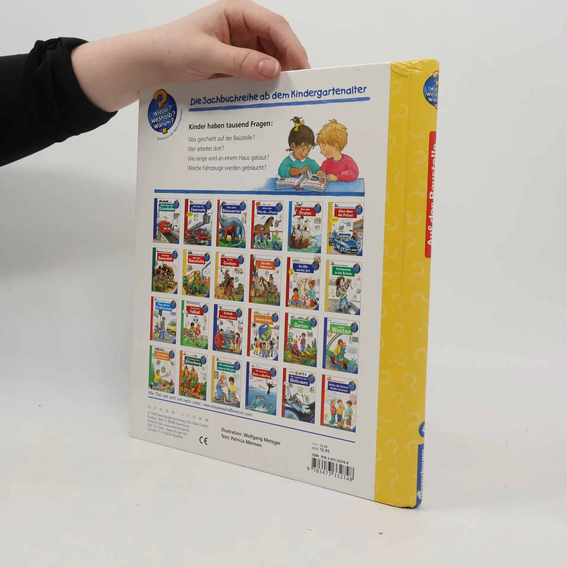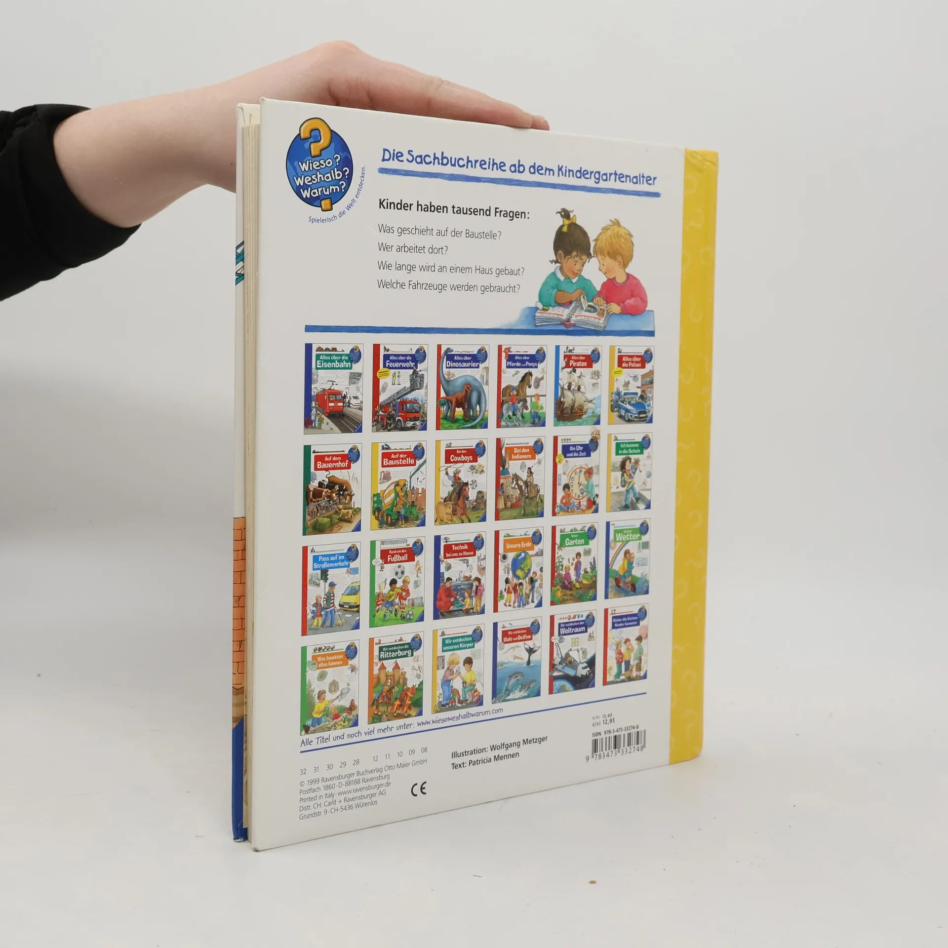 Mitten im Neubaugebiet bestaunen Kinder, wie Schritt für Schritt ein Haus entsteht: von der Vermessung über die Erdarbeiten und den Rohbau bis zum Innenausbau. Dabei entdecken sie Werkzeuge, Baumaschinen und Fahrzeuge. Klappen vermitteln, was Maurer, Zimmerleute und Elektriker für ihre Arbeit brauchen. Wie renoviert man ein altes Haus? Was passiert, wenn es abgerissen werden muss? Und wie werden Straßen und Brücken gebaut? Antworten finden Technik- und Fahrzeugfans in diesem Buch. Wieso? Weshalb? Warum? Die Sachbuchreihe für Kinder von 4–7 Jahren Jeden Tag entdecken Kinder etwas Neues – da kommen viele Fragen auf. Warum sind die Dinosaurier ausgestorben? Wo ist die Sonne in der Nacht? Wozu brauchen wir das Blut? Die beliebte Sachbuchreihe Wieso? Weshalb? Warum? gibt Kindern Antworten auf Augenhöhe. Dabei werden die unterschiedlichsten Themen aus der Alltags- und Interessenswelt der Kinder altersgerecht und mit viel Liebe zum Detail unter die Lupe genommen. Detailreiche Bilder, verständliche Sachtexte und überraschende Klappen, die Bewegungen oder Abläufe veranschaulichen und hinter die Dinge blicken lassen, ermöglichen Kindern, sich ihre Themen selbst zu erschließen. Der Spaß am eigenhändigen Entdecken, die liebevolle Umsetzung und die qualitativ hochwertige Ausstattung garantieren langanhaltende Freude an jedem einzelnen Buch.