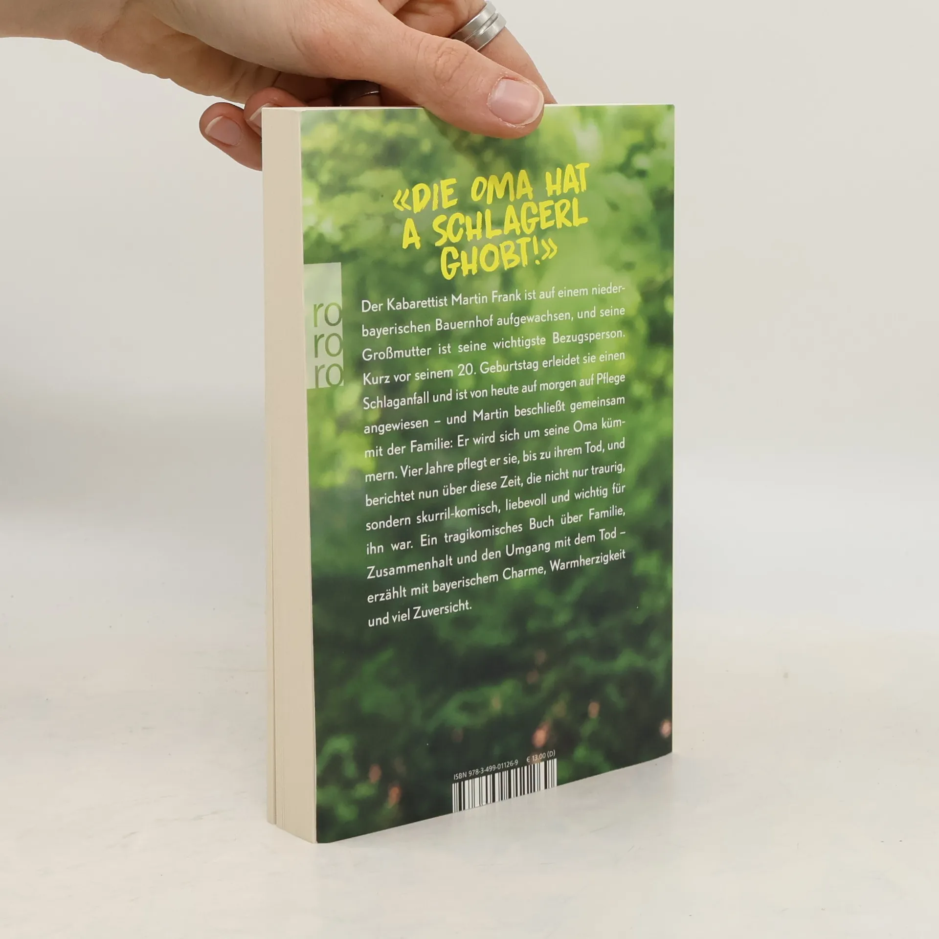 «Die Oma hat a Schlagerl ghobt!» Der Kabarettist Martin Frank ist auf einem niederbayrischen Bauernhof aufgewachsen, und seine Großmutter ist seine wichtigste Bezugsperson. Als er gerade 19 ist, erleidet sie einen Schlaganfall und ist von heute auf morgen auf Pflege angewiesen – und Martin beschließt: Er wird sich um seine Oma kümmern. Vier Jahre pflegt er sie, bis zu ihrem Tod, und berichtet nun über diese Zeit, die nicht nur traurig, sondern skurril-komisch, liebevoll und wichtig für ihn war. Ein tragikomisches Buch über Familie , Zusammenhalt und den Umgang mit dem Tod – erzählt mit bayrischem Charme, Warmherzigkeit und viel Zuversicht .