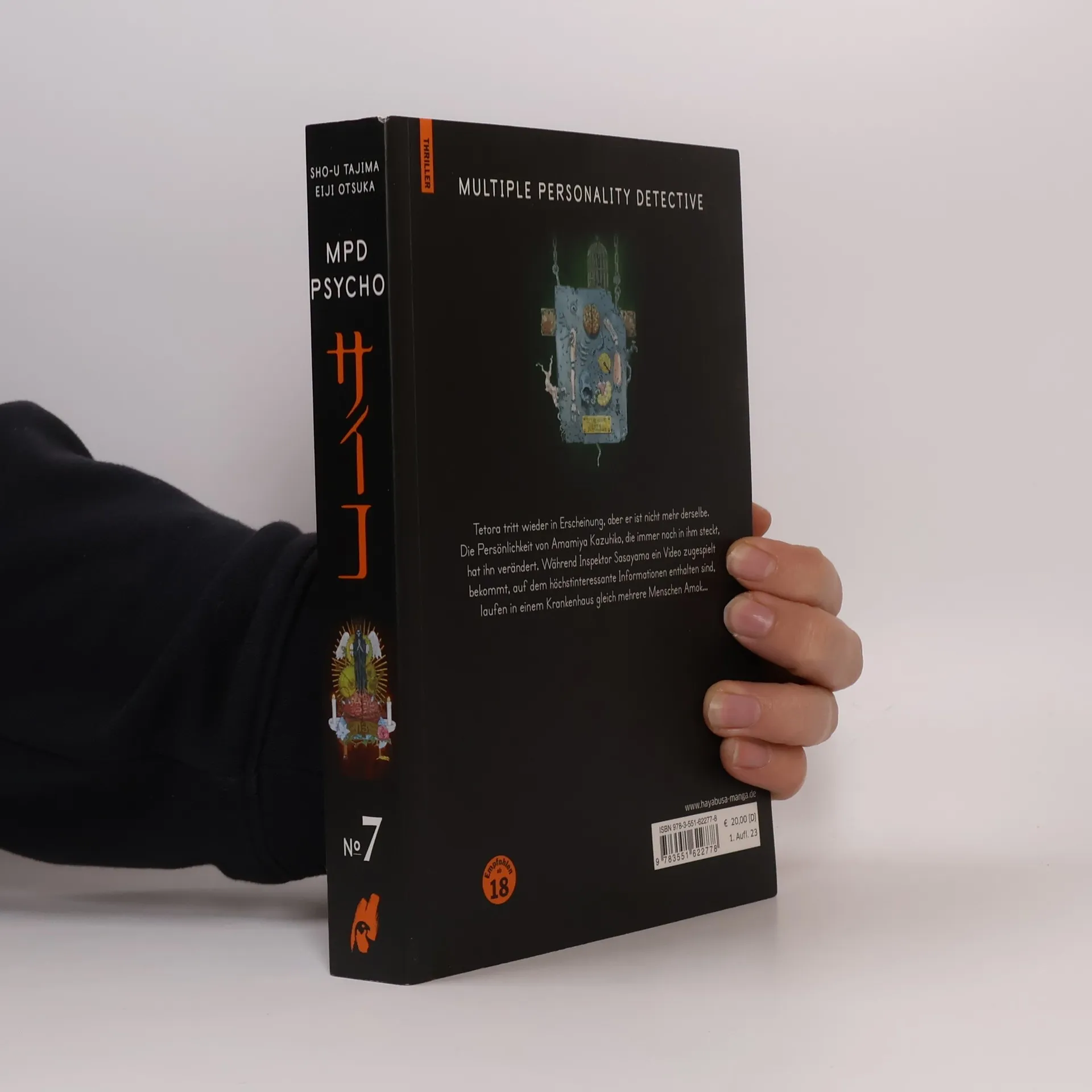 Ein (Alb)Traum wird wahr! Die deutsche Manga-Szene hat lange auf die erste deutschsprachige Ausgabe dieses zeitlosen Klassikers gewartet. Endlich erscheint das schockierende Werk auf Deutsch! Yosuke Kobayashi, ein Polizist, ermittelt in einer bizarren Mordserie und wird persönlich in den Fall verwickelt, was bei ihm eine dissoziative Identitätsstörung auslöst. Die Jagd nach dem Serienkiller endet katastrophal: Yosuke wird wegen Mordes verurteilt und landet im Gefängnis, bleibt jedoch als Profiler für die Mordkommission aktiv. In Tokyo wütet eine „Serienmörder-Epidemie“, mit kreativen und brutalen Tätern, die alle eine absonderliche Gemeinsamkeit aufweisen: einen mysteriösen Strichcode im linken Auge. Diese Geschichte zieht die Leser*innen in einen albtraumhaften Strudel voller eigenartiger Protagonisten und brutaler Schockmomente. Der realistische und kontrastreiche Zeichenstil von Sho-u Tajima verstärkt den Eindruck und schafft unvergessliche Bilder. Der erste Band dieses umstrittenen Psychothrillers erschien 1997, brillant geschrieben von Eiji Otsuka, und die Serie endete 2016 mit insgesamt 24 Bänden, ohne vorherige deutschsprachige Umsetzung. HAYABUSA veröffentlicht das Werk komplett ungeschnitten und unzensiert in 12 hochwertigen Doppelbänden.