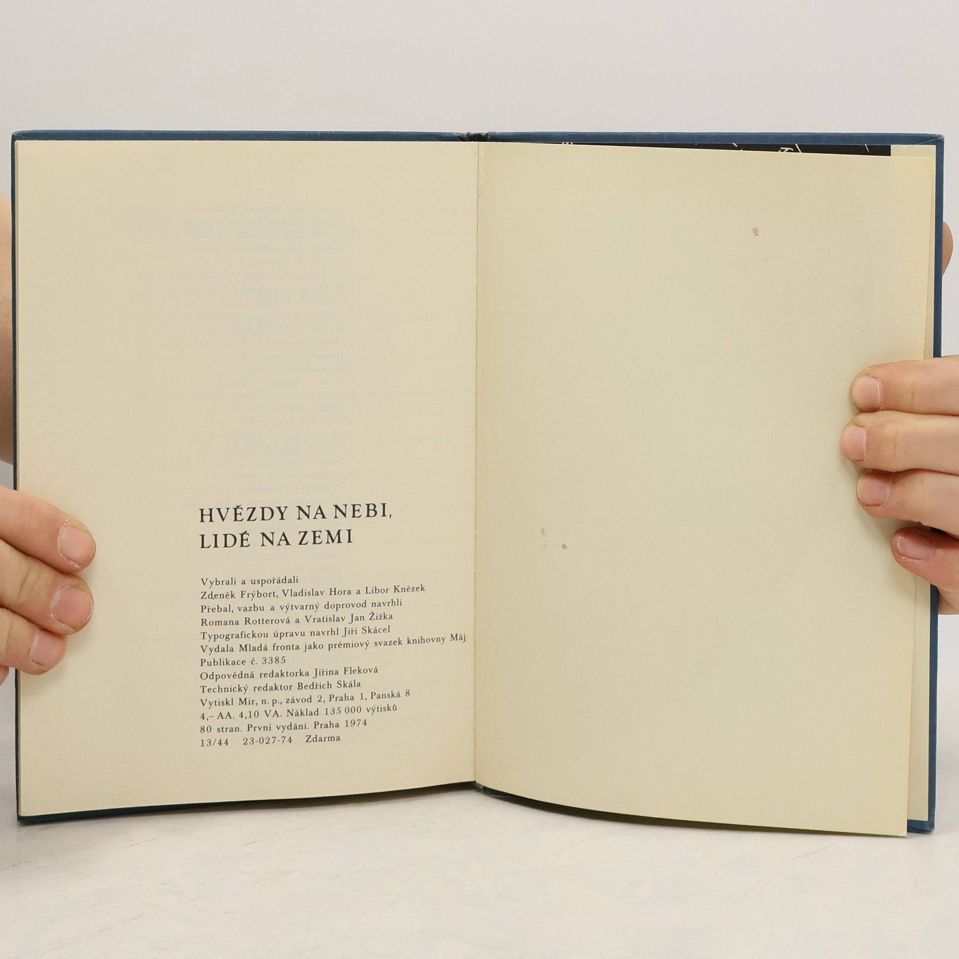 Výběr básní od několika českých a slovenských autorů. Verše o hvězdách, měsíci, vesmíru a družicích, a to jako věčném básnickém obraze, jehož se dotýká život lidí na Zemi, ale i jako lidské touze po zvládnutí kosmu. Knihu průběžně provázejí reprodukce lidových dřevořezeb zestředověkého kalendáře Johanna z Gmündenu a fotografie hvězdných a vesmírných představ na starých mapách a ve výtvarném umění. Prémie 12. ročníku edice Máj. 23-027-74