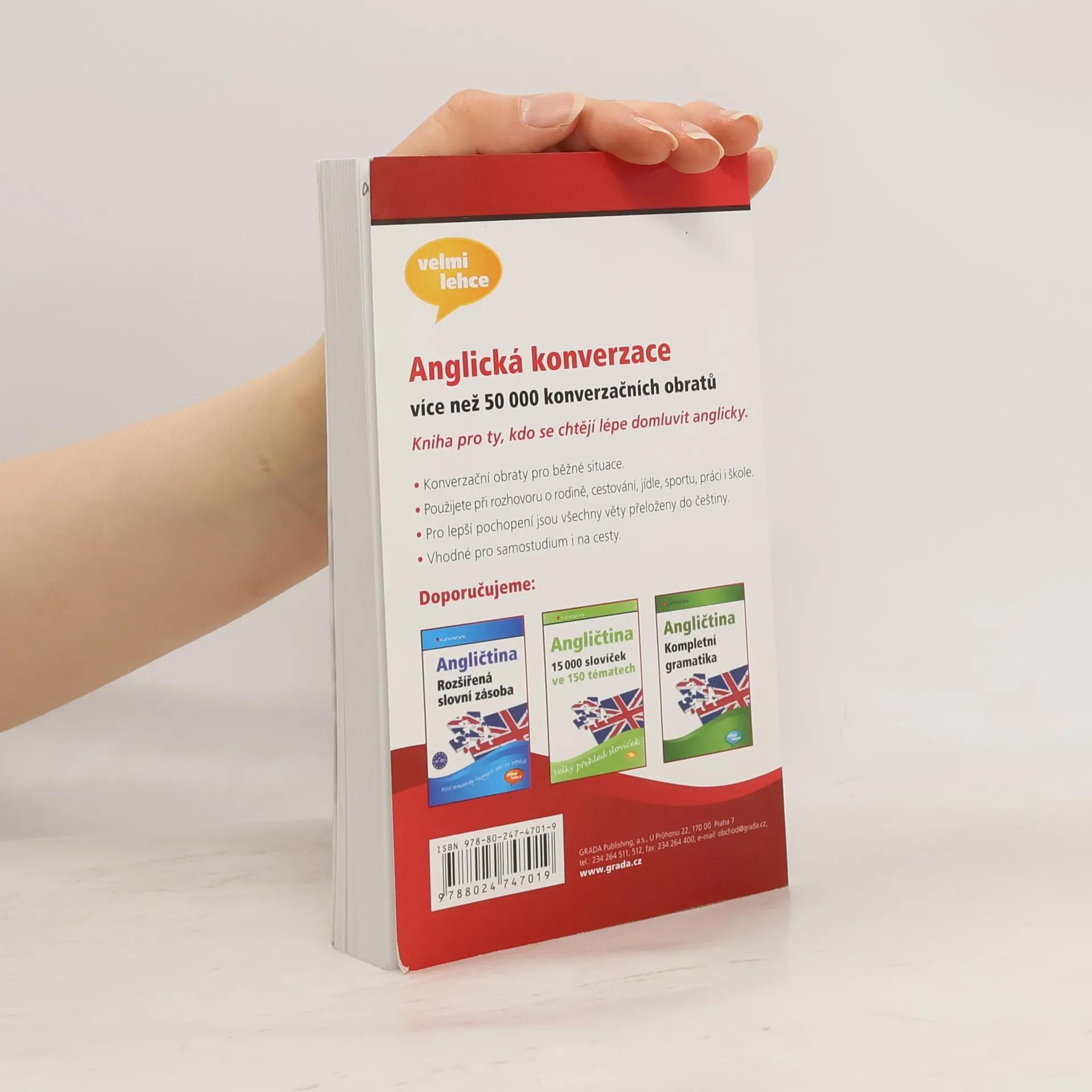 Užitečná příručka pro všechny, kdo mají obavy z konverzace v angličtině. Na 324 stranách probereme všechny běžné situace, kdy byste se museli vyjadřovat, ptát a odpovídat v angličtině - komunikační fráze; slovní spojení, která je třeba znát při cestování, při návštěvě restaurace a kavárny, na poště, v bance, fráze o penězích; jak mluvit při návštěvě lékaře, zubaře a nemocnice; komunikace po telefonu, jak napsat osobní dopis, jak vyjádřit nejistotu, oblibu, politování, zklamání a očekávání; jak hovořit o počasí, škole, zaměstnání, kultuře, sportu, politice, bydlení a nakupování. Všechny anglické obraty a ukázkové věty jsou přeloženy do češtiny. Text je doplněn inforámečky o hovorových tvarech a reáliích. Vhodné pro samouky.